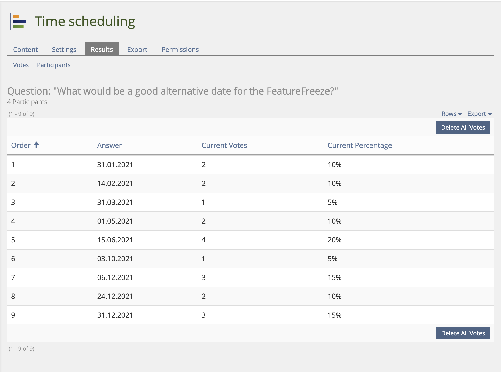 - The personalized display of results in the results tab is not visible from the outside. (Precondition: Display Results is set to "After Vote" or "After Voting Period".)
