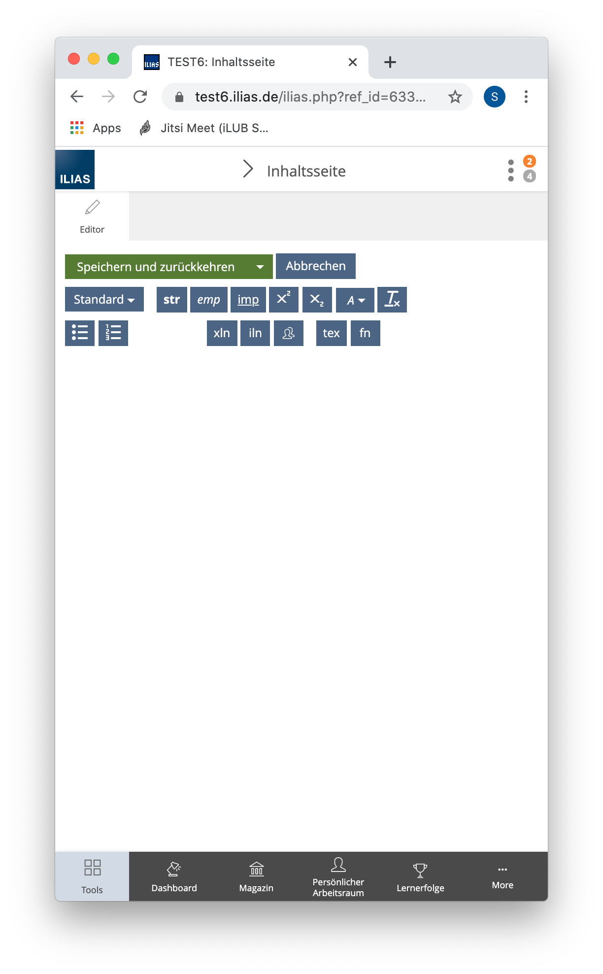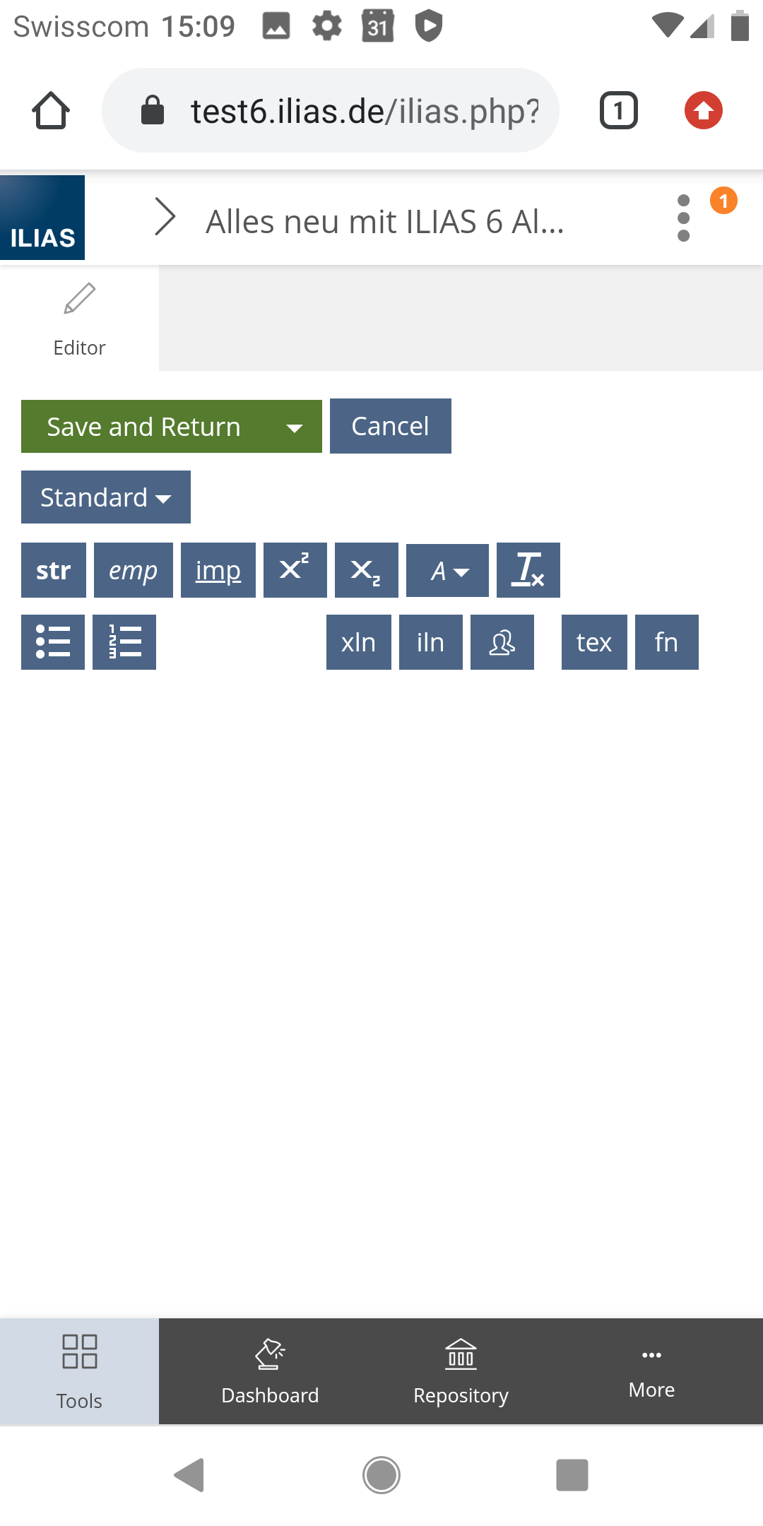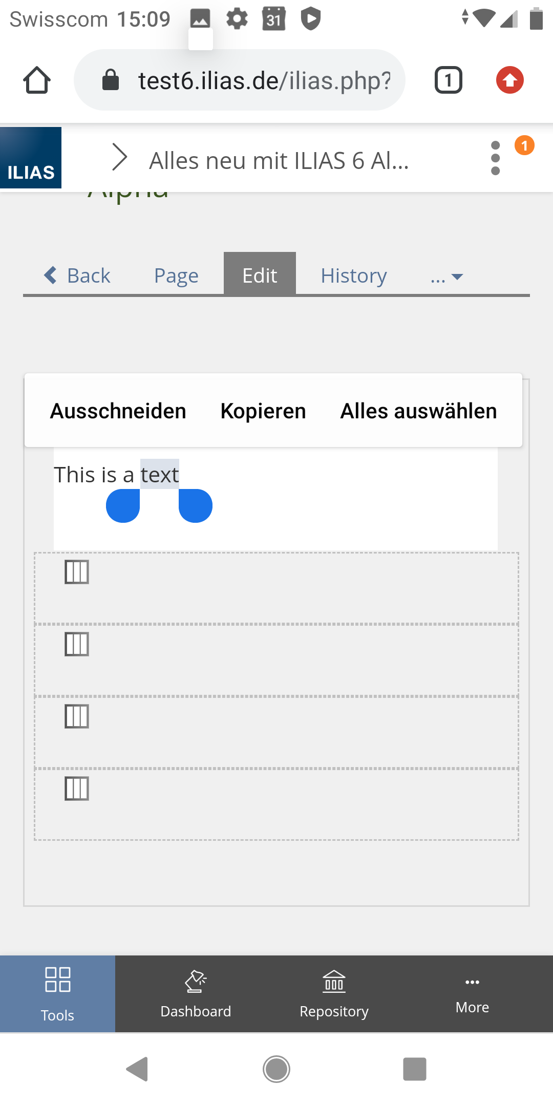 When clicking on an existing text paragraph (or when adding a new text paragraph) the editor-slate will be opened to fill the page. There you will find a text input field of fixed size and the actions (formatting).