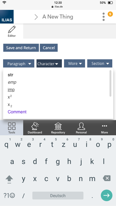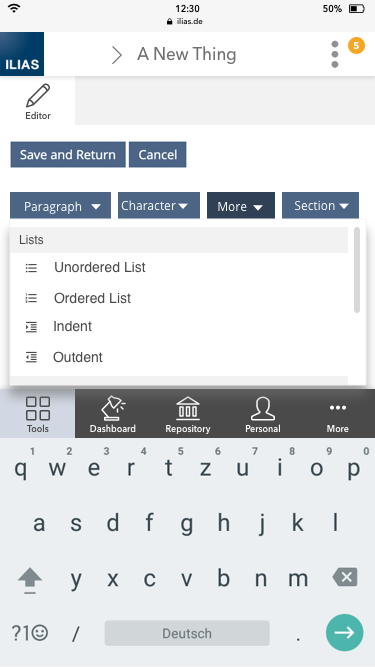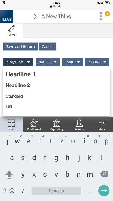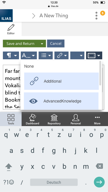 JourFixe, ILIAS [jourfixe], 22 FEB 2021: We highly appreciate this suggestion and schedule the feature for ILIAS 8. It would be very helpful to indicate the selected section and paragraph style in the shown dropdowns above. This needs to be discussed and decided in the Kitchen Sink. In addition, the additional icons on screenshot 5 before the different list styles and other formattings would be helpful to. But at least there is already a fallback, see screenshot 4. Both topics should be decided in the KS and the ported to the page editor.