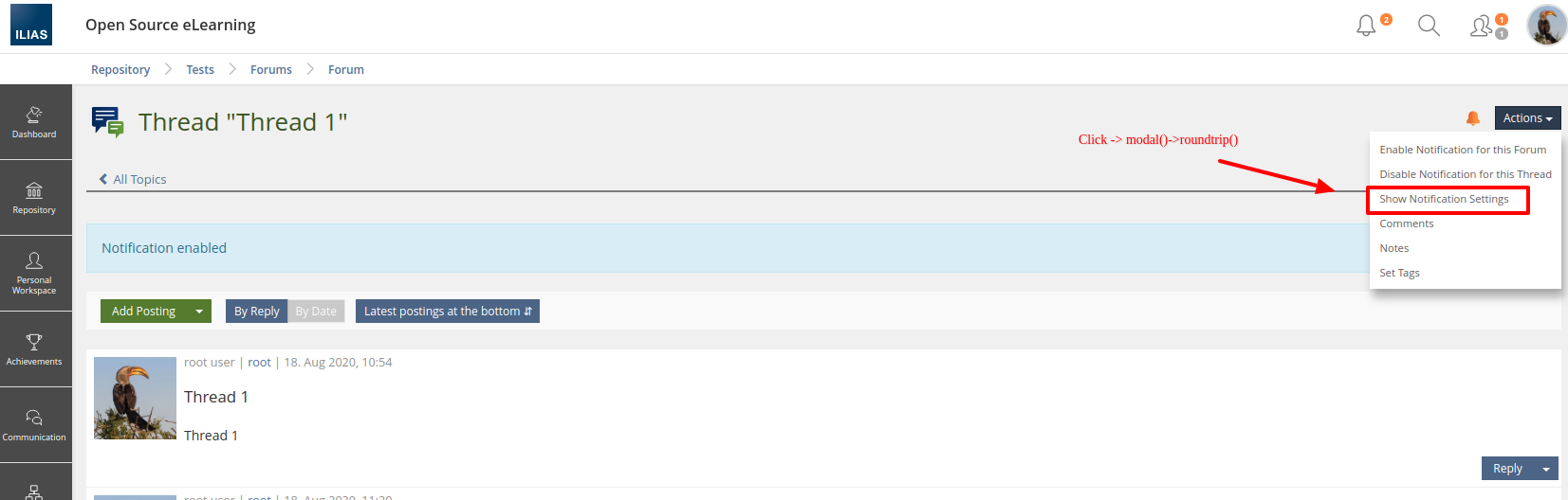 - For users with higher privileges (in course/group forums): Forum / Settings / Notifications