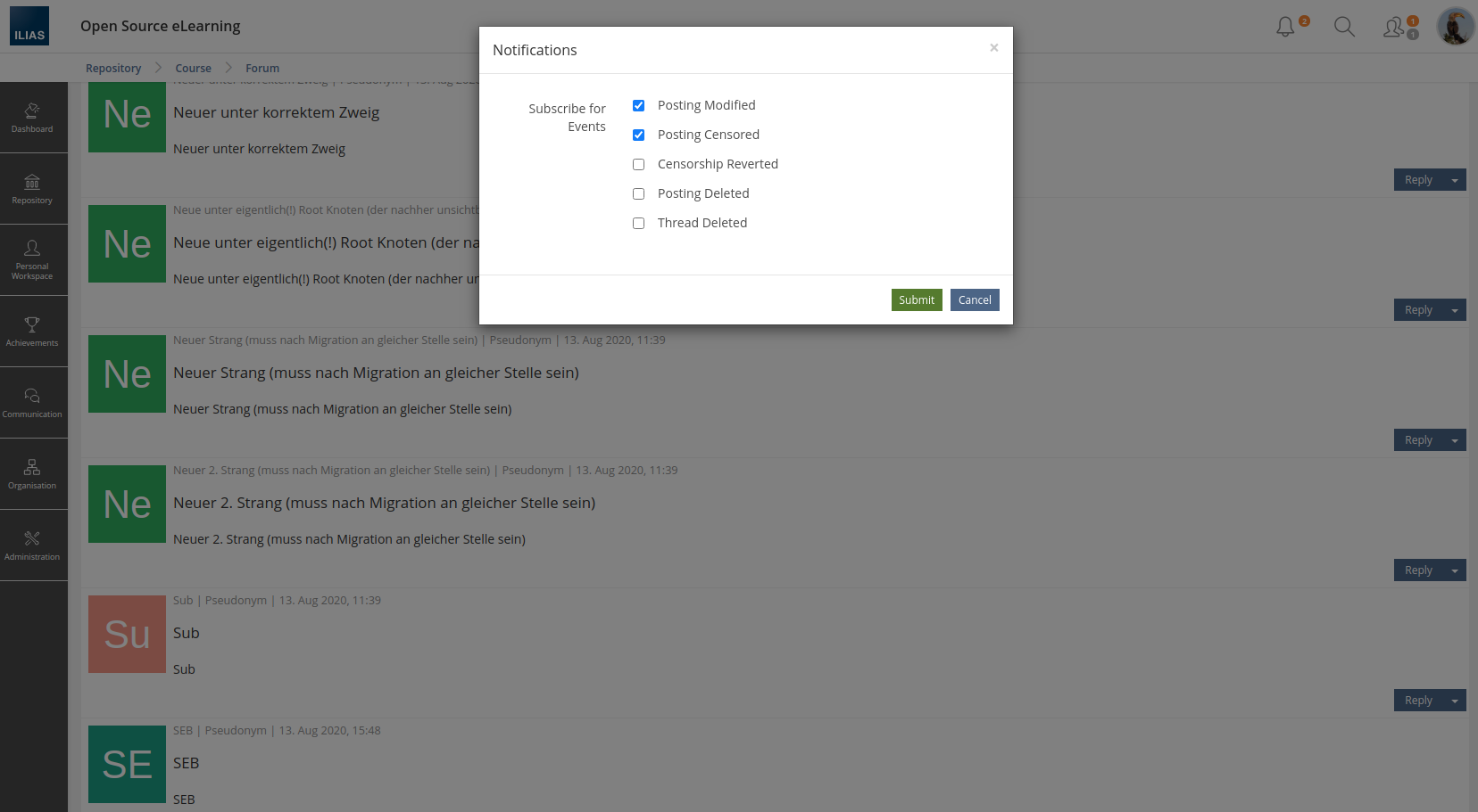 If a forum is located in a course or a group, users with higher privileges are already able to define whether or not users should be forced to receive notifications. For this scenario, these modators/administrators must be able to also defined the events for users should receive an (forced) e-mail for.
