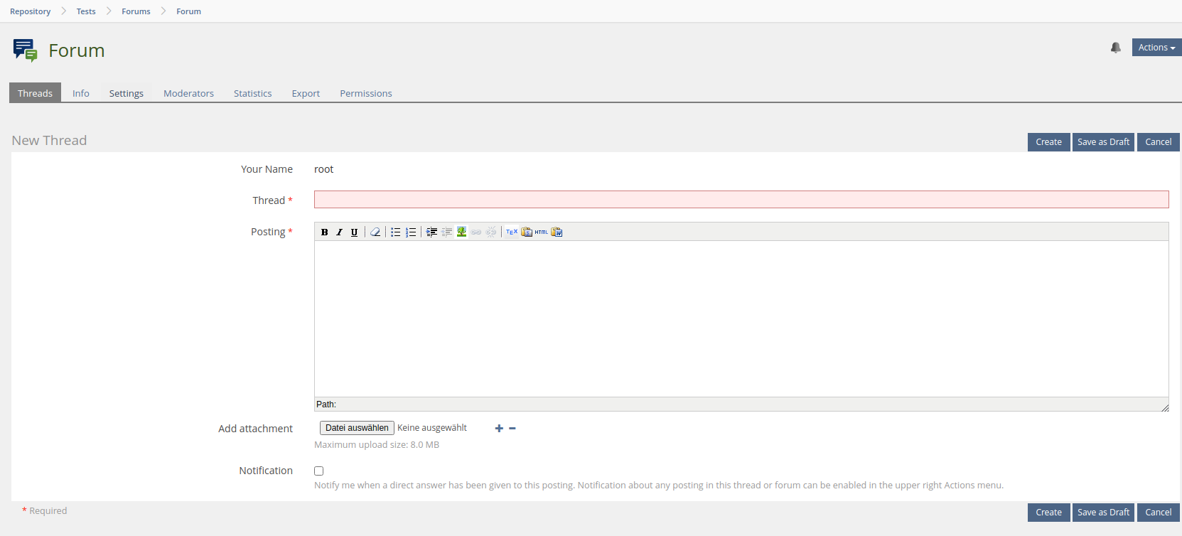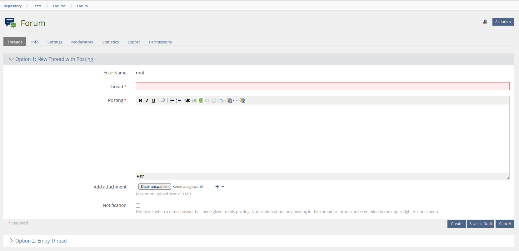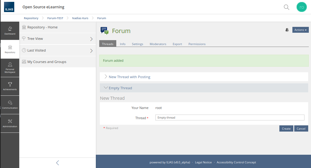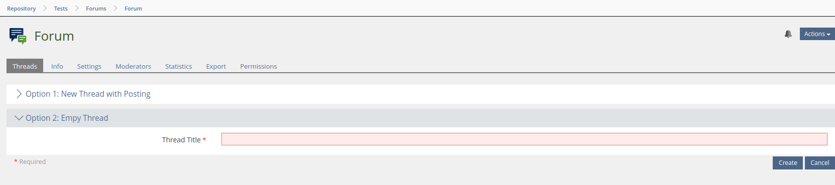 If users want to to create a thread in a forum, they always have to create a first posting. It is not possible to create empty threads (only by deleting all posts afterwards). In some scenarios it is useful to provide a set of forums with empty threads (as a scaffold for defined topics) in a course or another container.