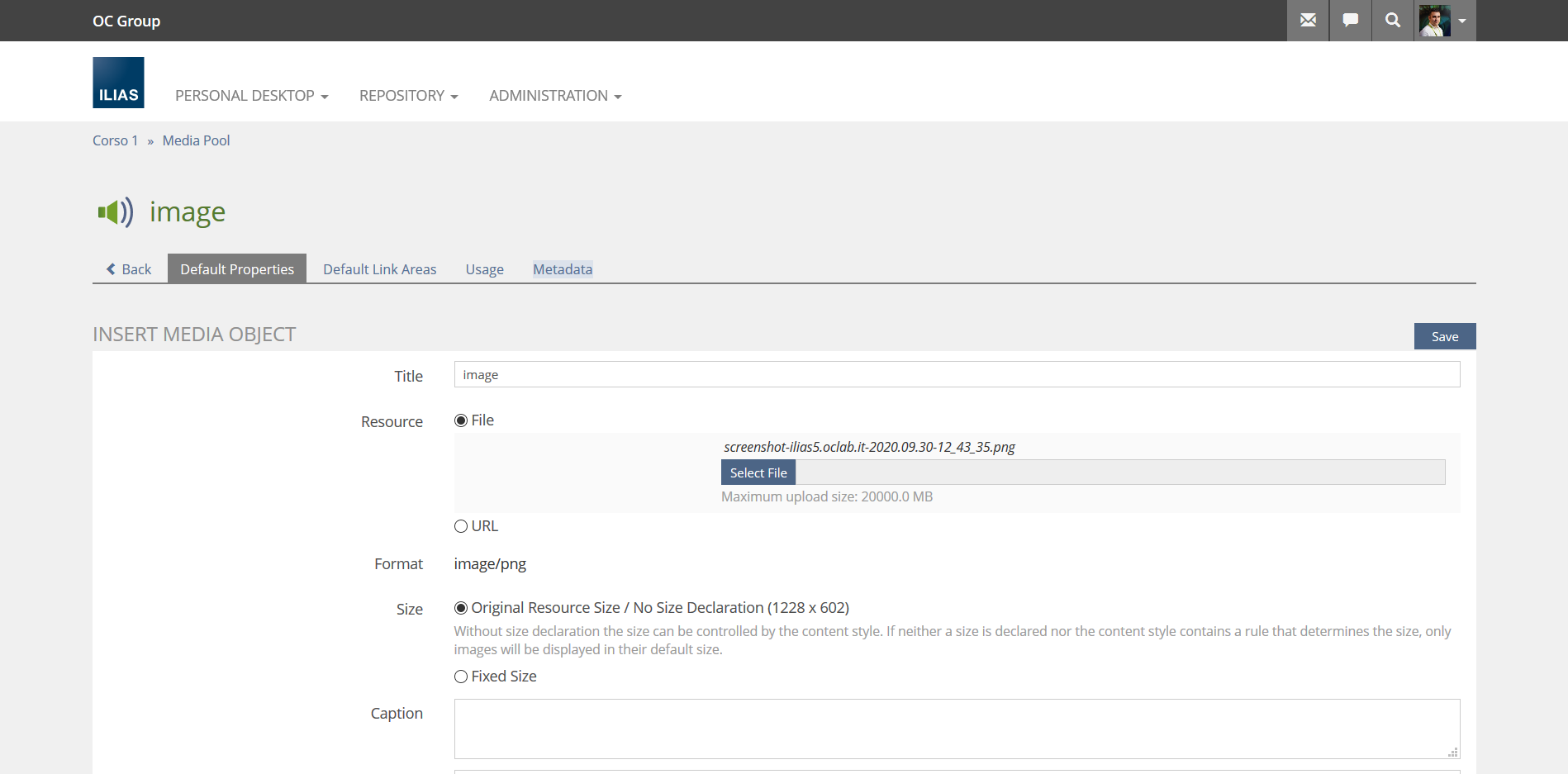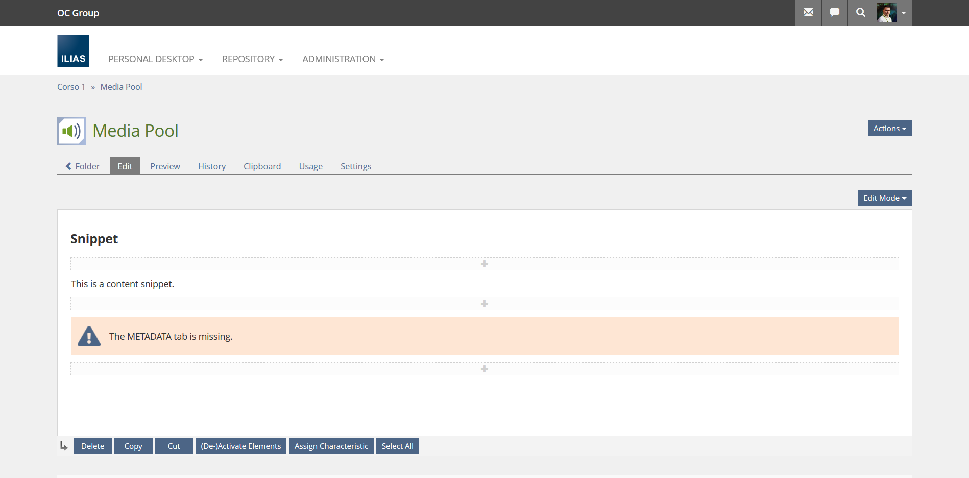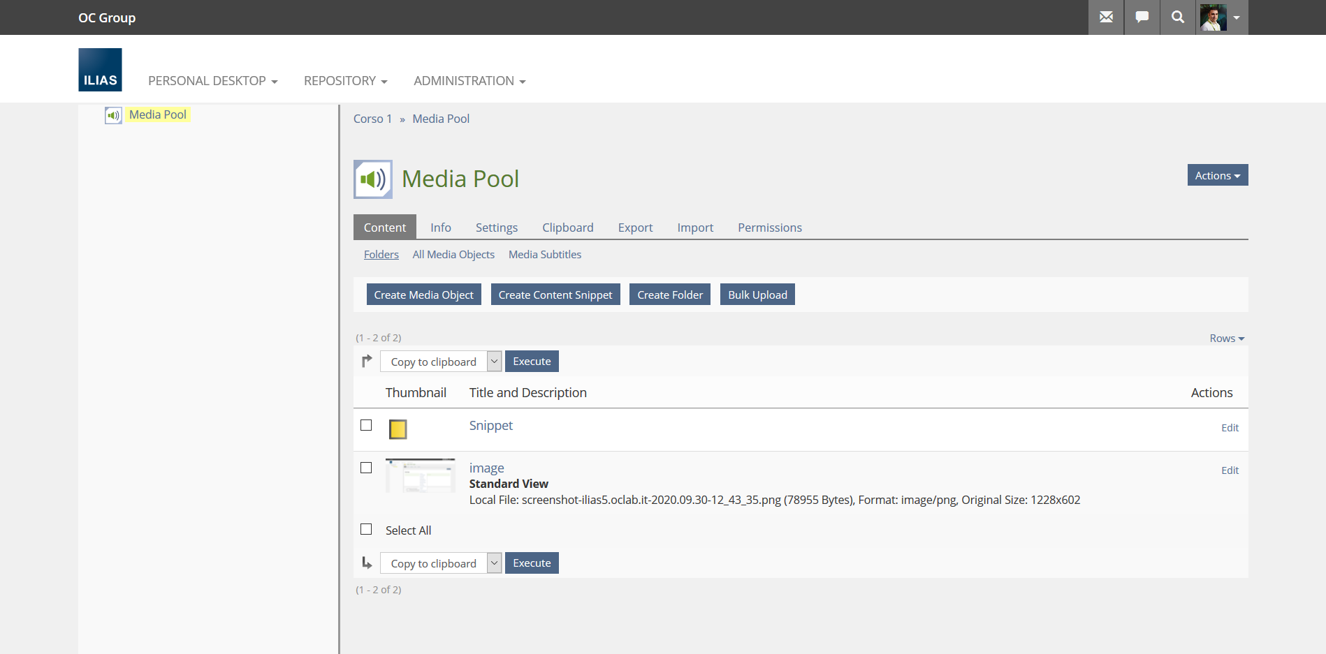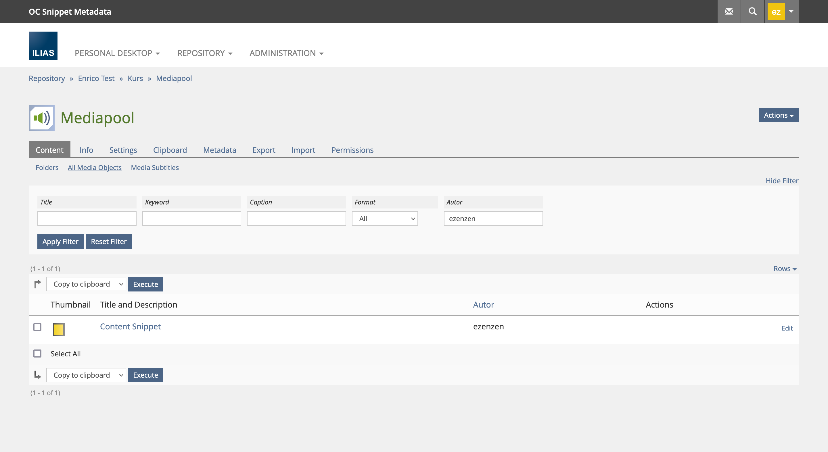 in a media pool both snippet objects and, for example, images, can be stored. As you can see in the screenshots, we created a test media pool with a snippet and an image. The image has the METADATA tab that allow to edit and contains metadata.