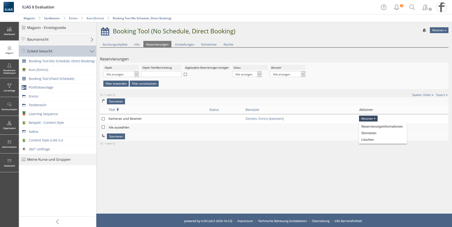 In the column Actions on the "Reservations"-tab an action menu is introduced. The action menu contains the entries "Cancel Reservation", "Delete" and "Post Booking Information". This makes it easier for users to find the information.