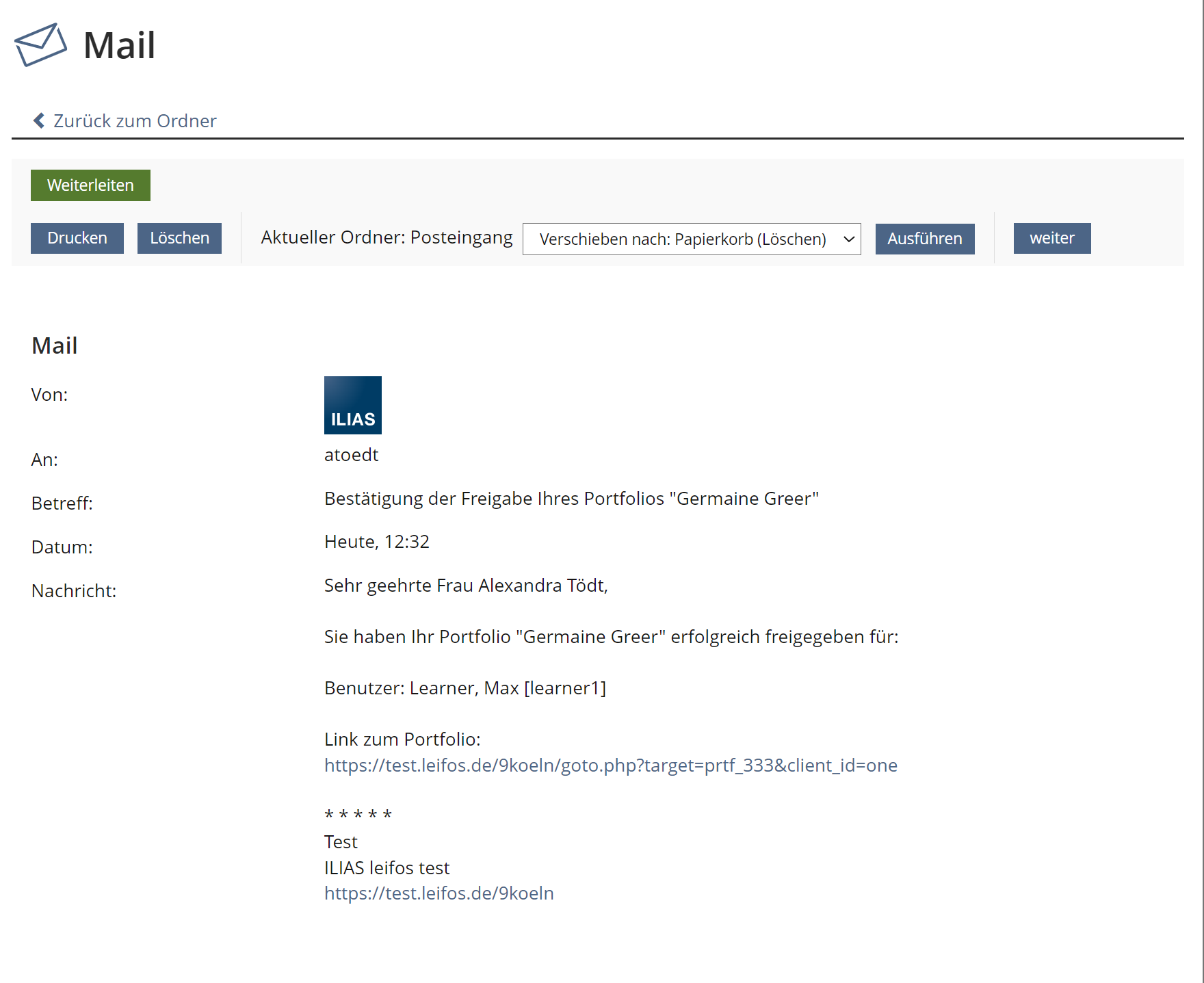 To address this problem we suggest to implement an ILIAS confirmation E-Mail that is sent to the sharer of the portfolio after he/she successfully shared his/her portfolio.