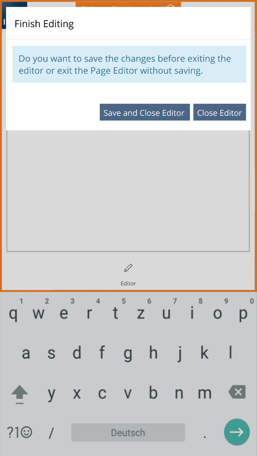 - The page editor can be closed via the Mode Info. If a user also clicks Finish Editing, a modal opens at this moment if there is unsaved content. The user must confirm whether he wants to save unsaved changes or exit the editor without saving.