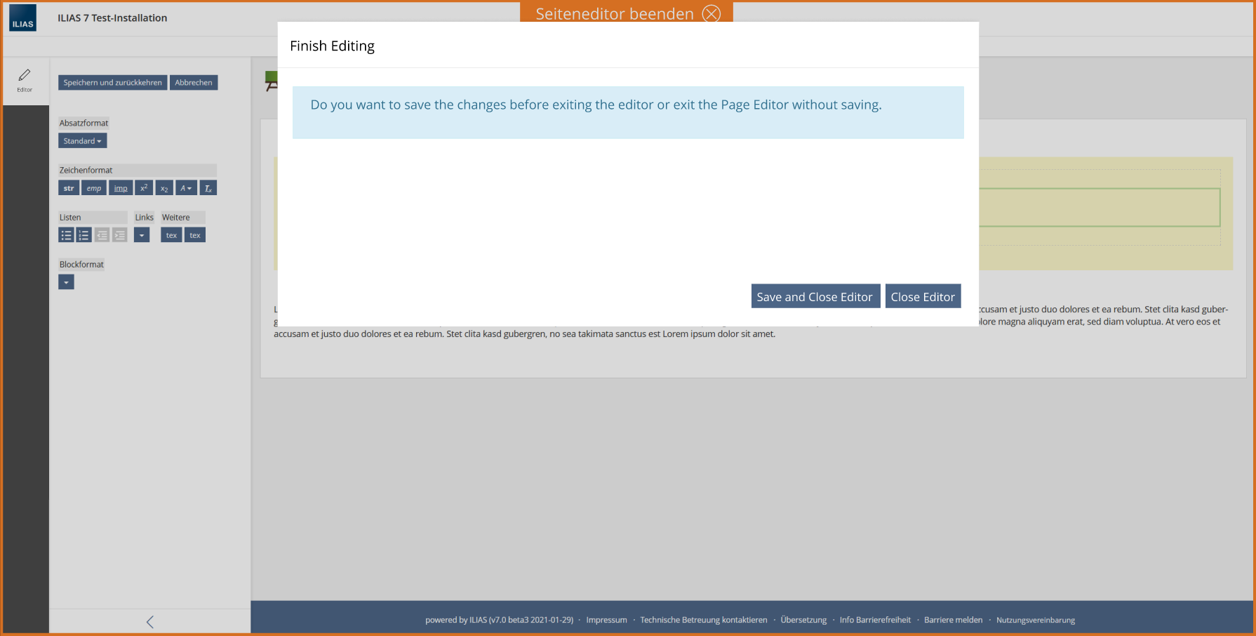 Already in ILIAS 5.4 the page editor was displayed in a kind of mode. The Main Menu and the TopBar were not displayed, so the user's focus was on editing the page.