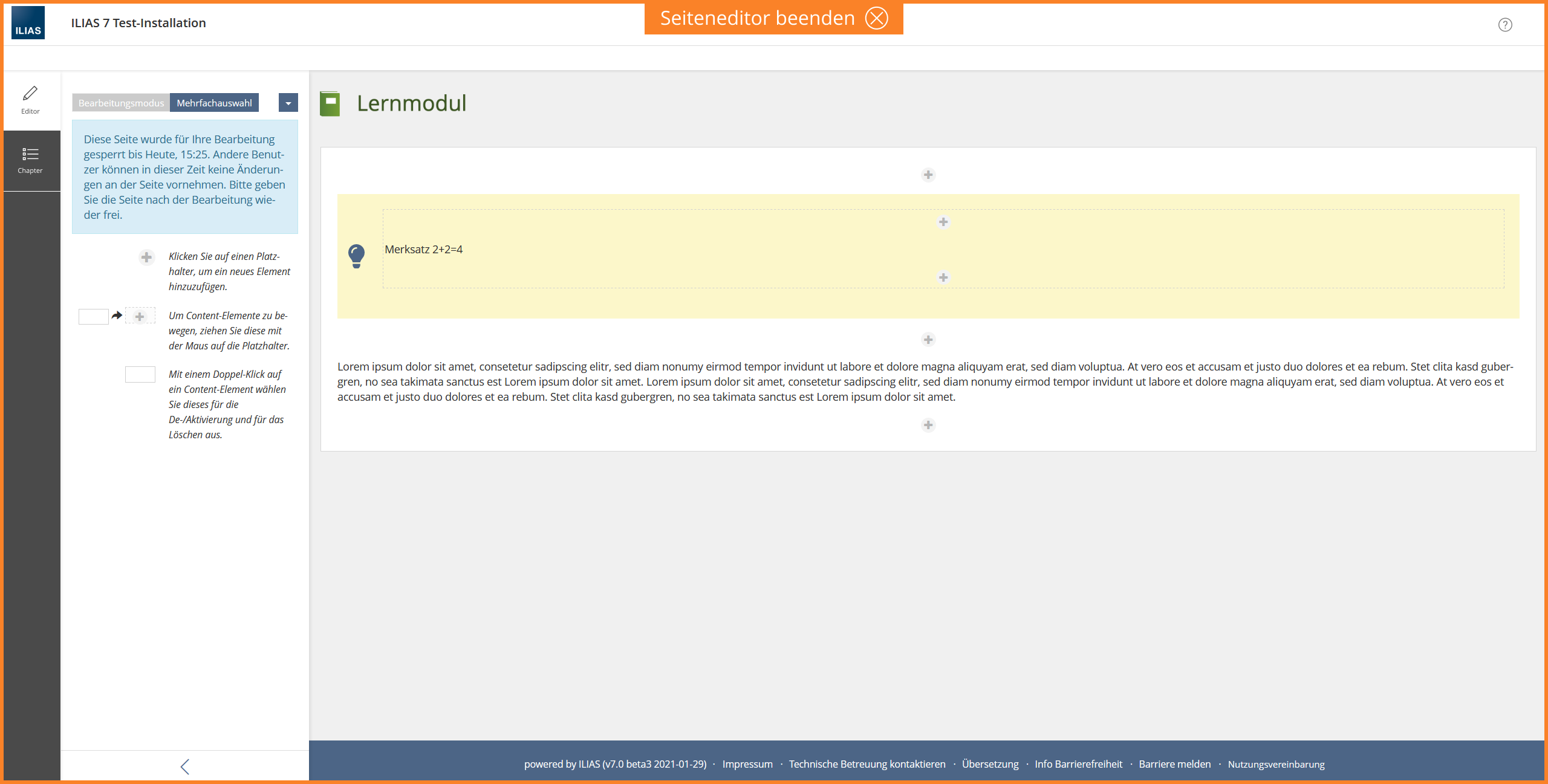 If a page is being edited, a user is exactly at such a point where he/she wants to focus on the current work step and the tools that go with it (like add and formatting text, add images and column, change page in a learning module, choose another block format, etc.). The mode approach, for example, is already known from the Learning Sequence.