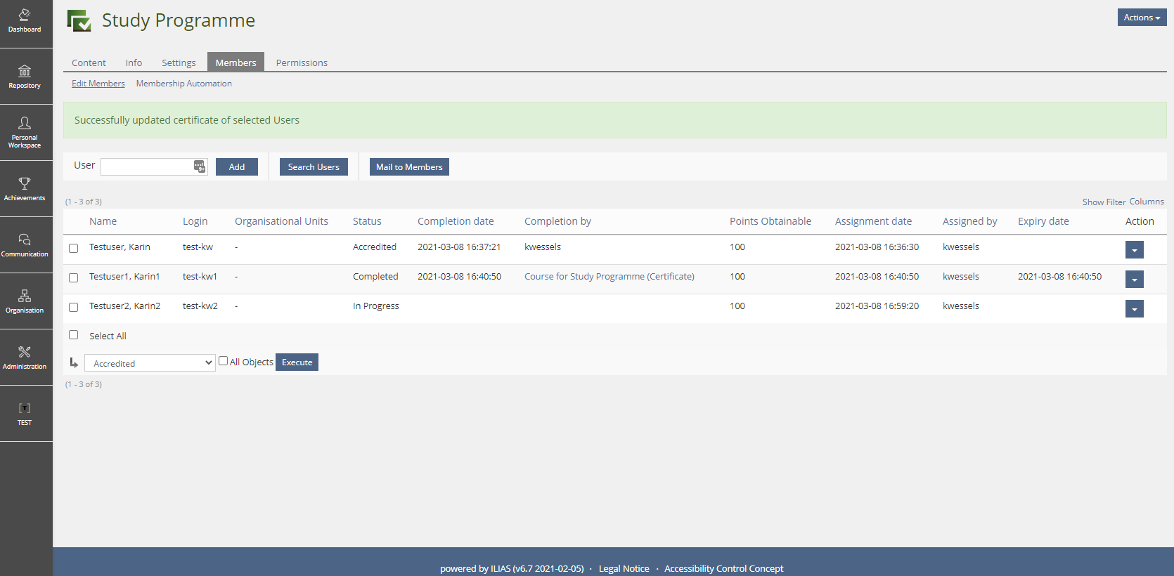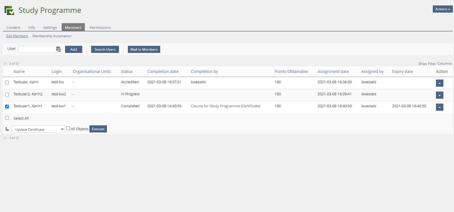 Study Programme: New Action ’Update Certificate’ for Members Tab