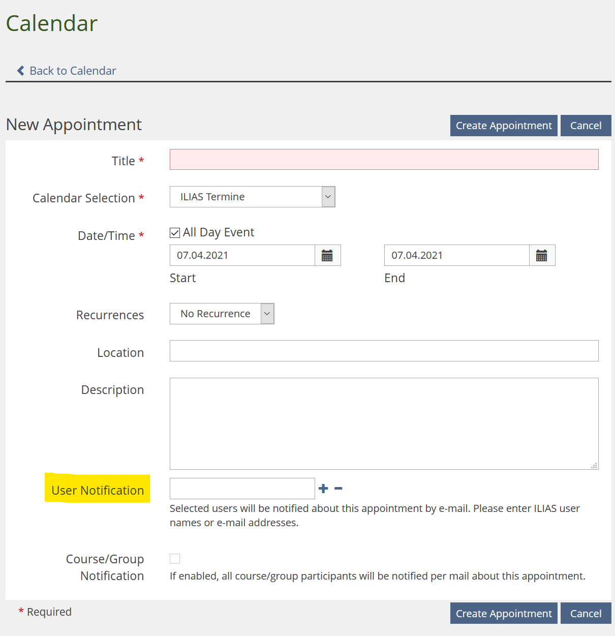 When creating a new appointment the field "User Notification" does not suggest users like in the tool bar of the member tab.