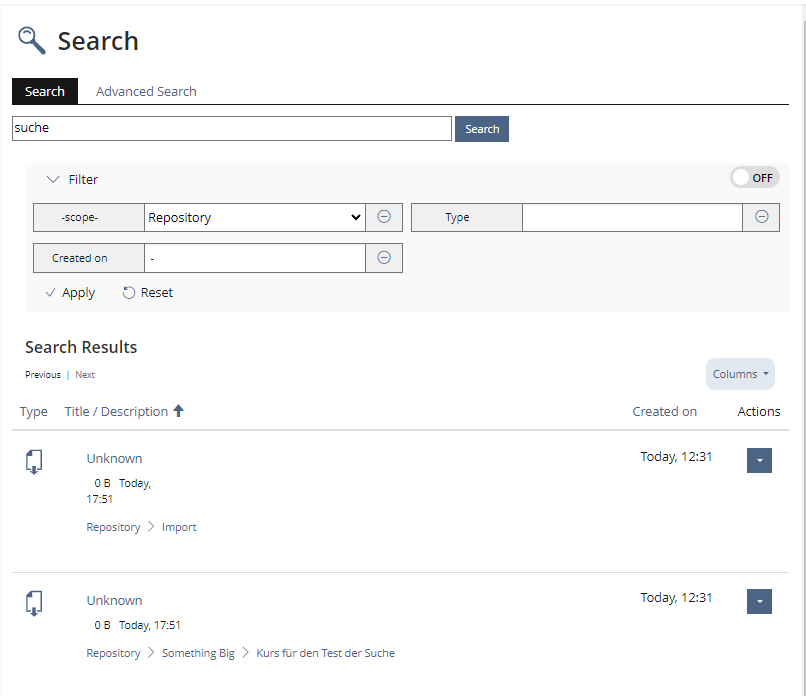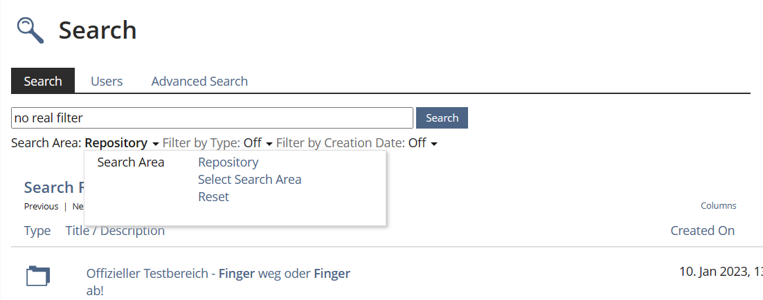 JourFixe, ILIAS [jourfixe], 16 SEP 2024: We agree with Thomas' suggestion. No need to have an additional filter for title and description as this is covered by the search input. And we highly appreciate that filtering for creation dates is also possible with this new implemantion due to the new duration input.