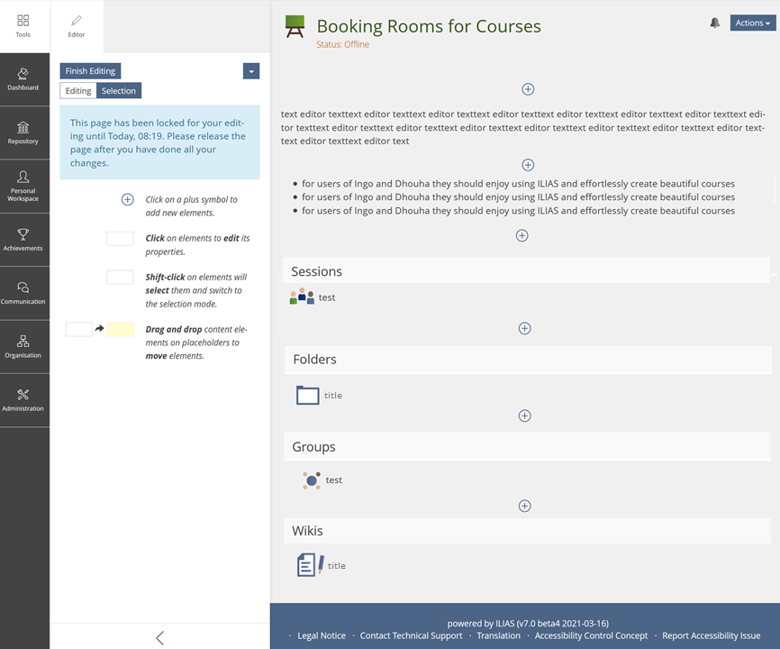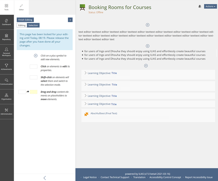 ILIAS mostly requires users to develop their objects and then write educational texts. Then users place objects between instructional texts. Suprisingly not everybody is this organised.