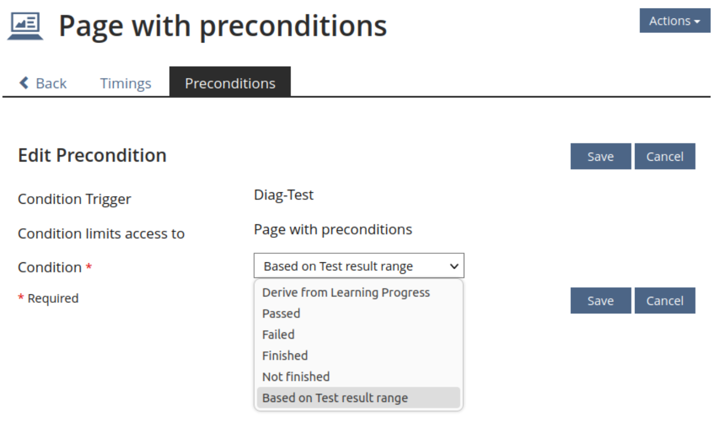 If possible, the screen that is used to choose objects as preconditions could offer learning objectives, too. the choices for the precondition should be passed/failed/percentage like in tests (finished/not finished/derive from LP con be omitted here)