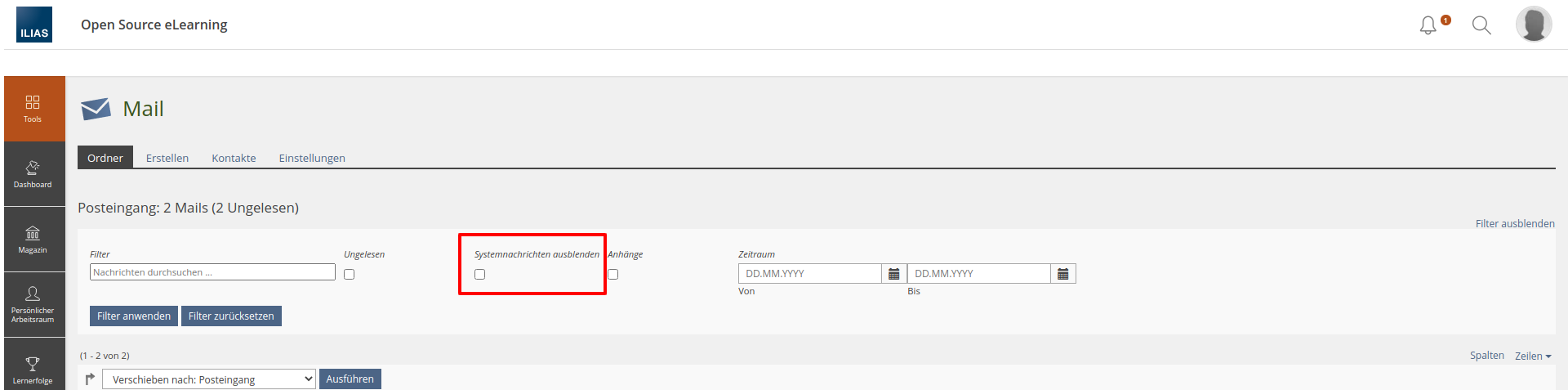 A number of filters already exist for mails. This is to be extended by the option "Hide system e-mails". (Default is deactivated.)