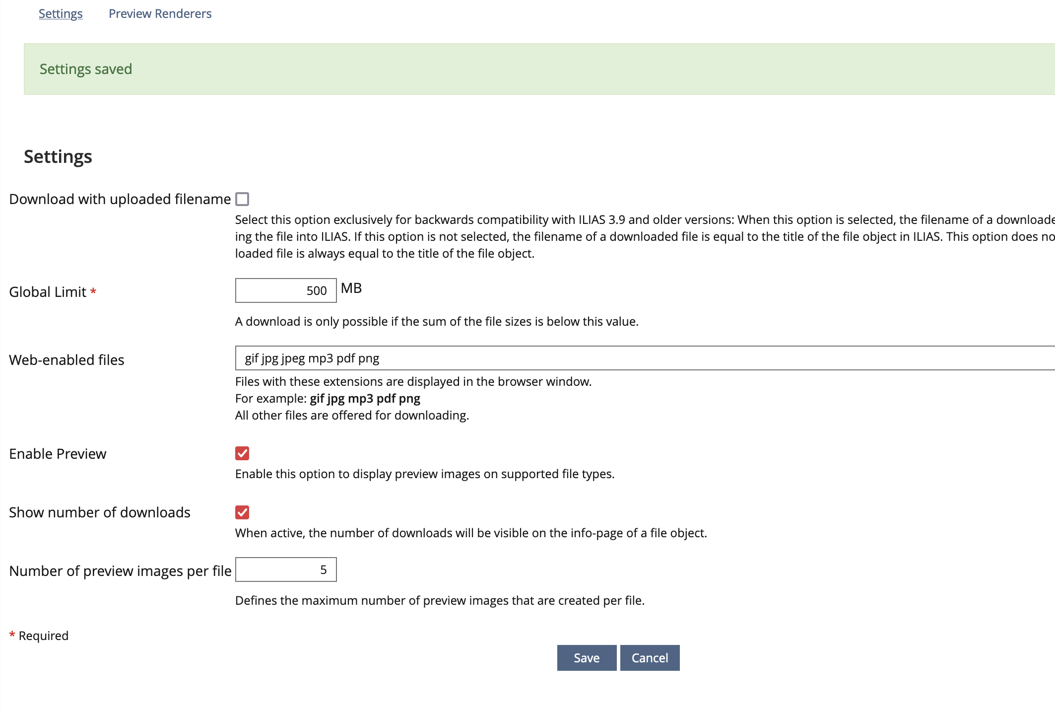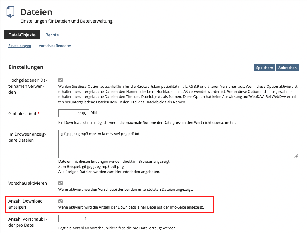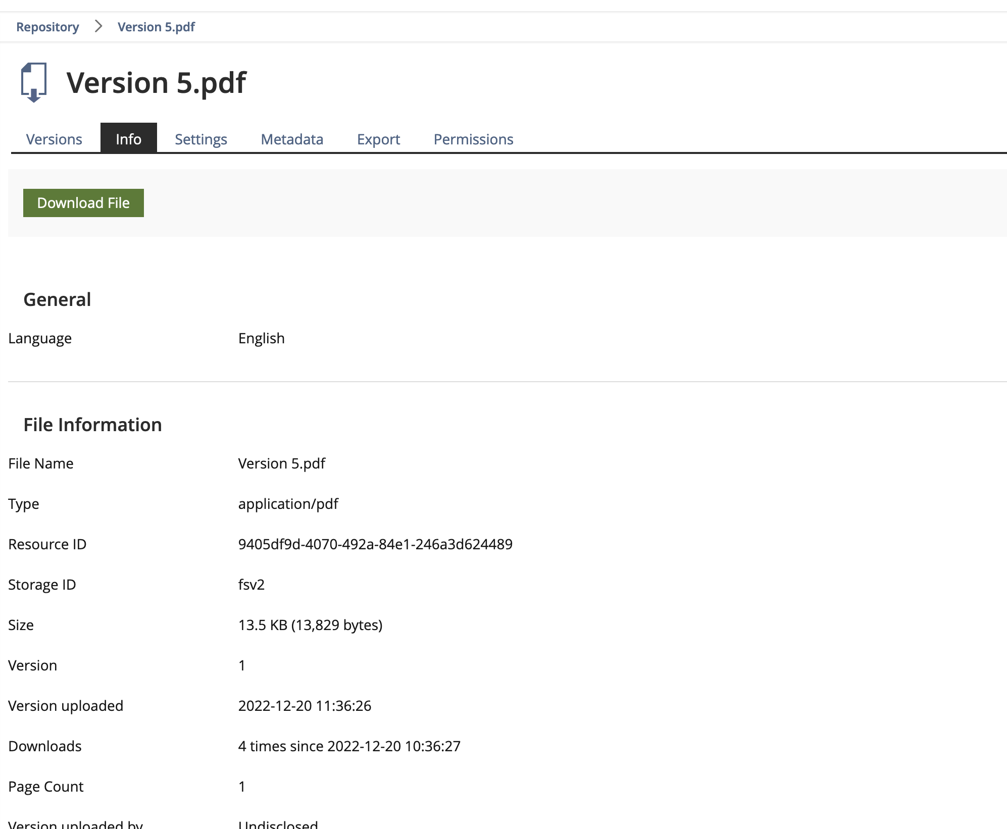In Administration -> Repository and Objects -> File, a new Checkbox (initially checked after update/installation) is implemented to activate/deactivate the display of the value on a File-Objects's info-Page. This setting has no relation to the setting "Show Tracking Information" in Administration -> Repository.