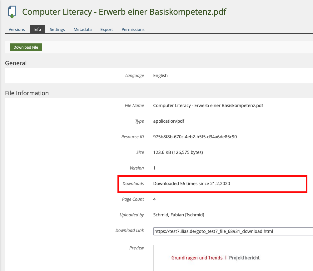The info page of a file object is extended to show the number of downloads. Initially (with an update step) the number of read-events is used as the number of downloads, the oldest entry in read_events for this file is used as the date. The display is also supplemented with the information since when the count has taken place (initial: creation date of the object).