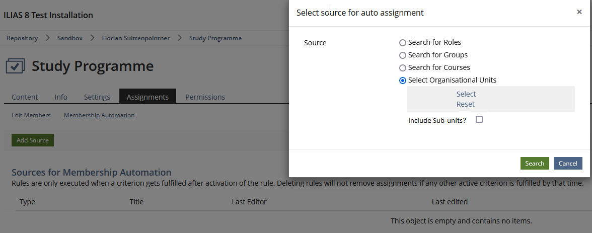 - When a source is added using the option "Select Organisational Units", an additional checkbox "Include Sub-units" appears below the buttons "Select" and "Reset".