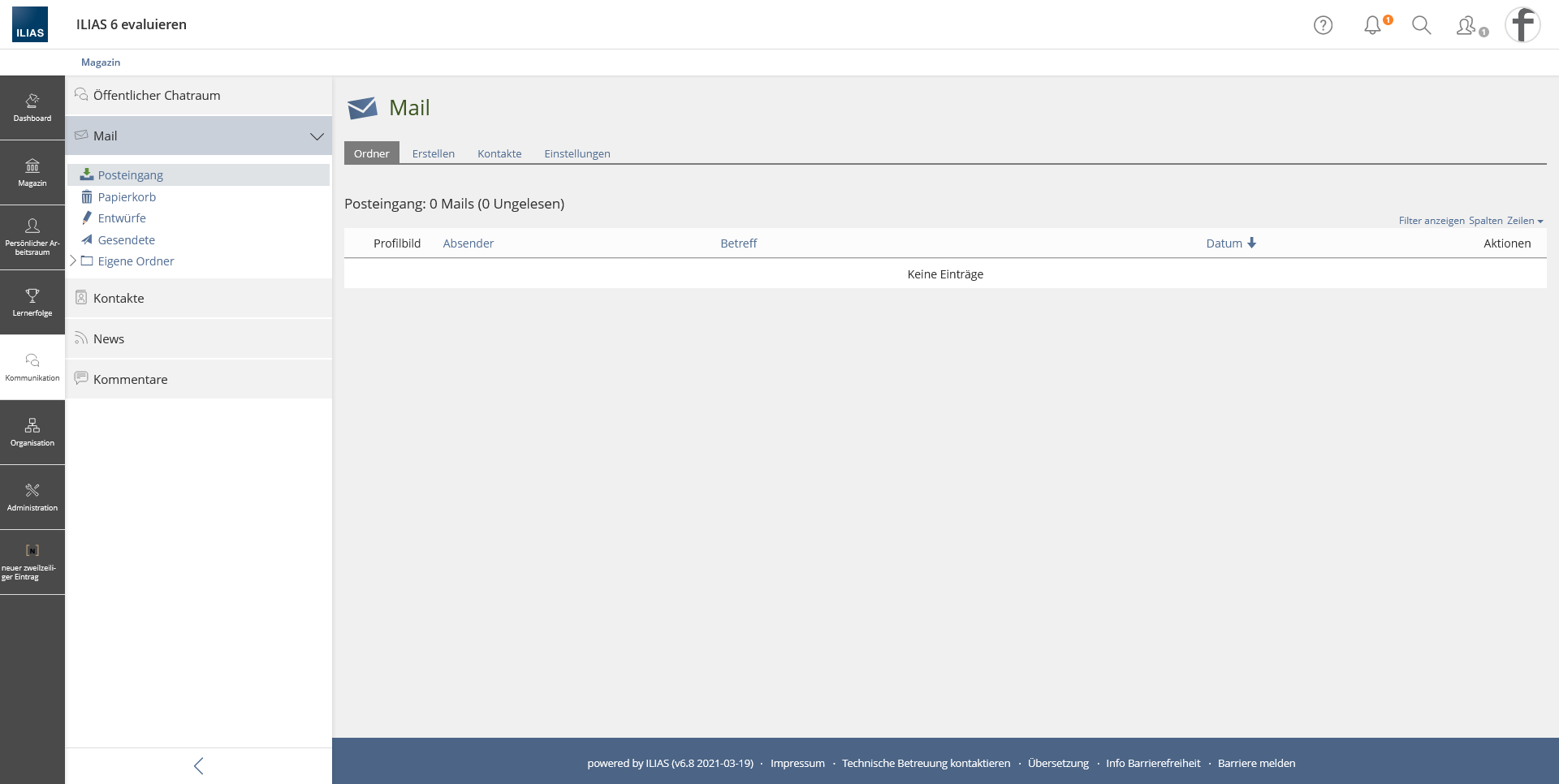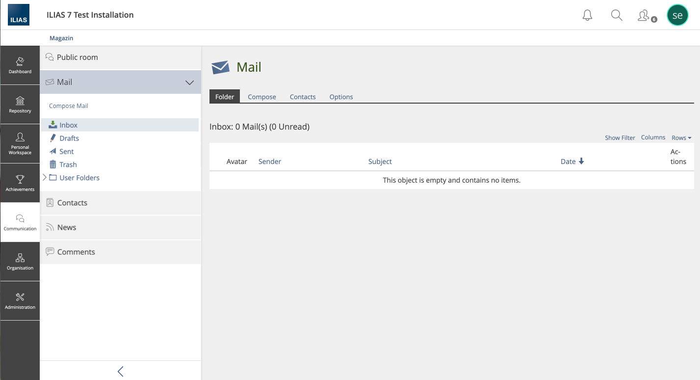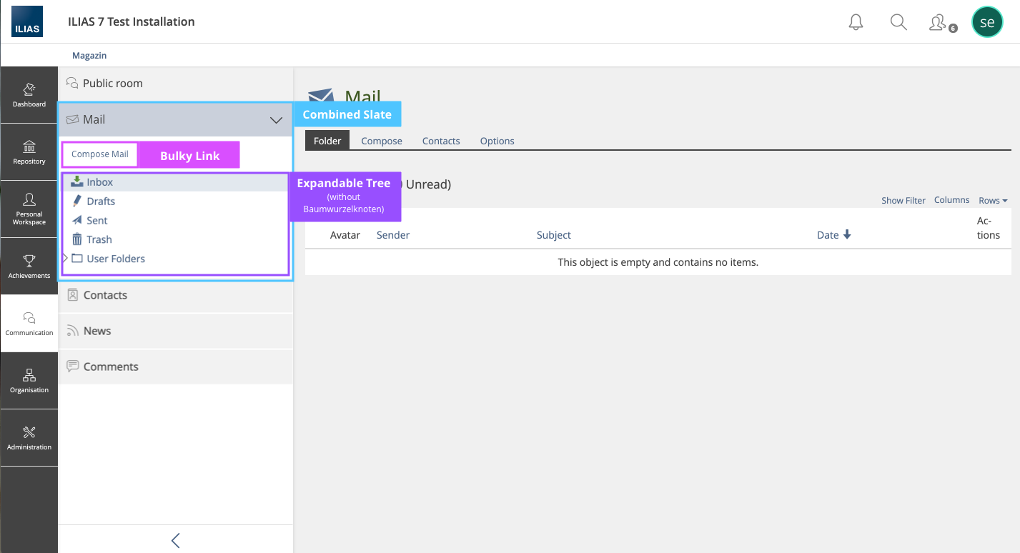 JourFixe, ILIAS [jourfixe], 31 MAY 2021 : We highly appreciate Yvonne's suggestions and accept the screen modifications and the new order of folders. Due to the fact that the reordering of the mail folders for existing users need a migration for each single user we accept this new sorting for newly created users only. Creating a new feature wiki page for a separate discussion of the "Create Mail" issue is accepted for ILIAS 8.