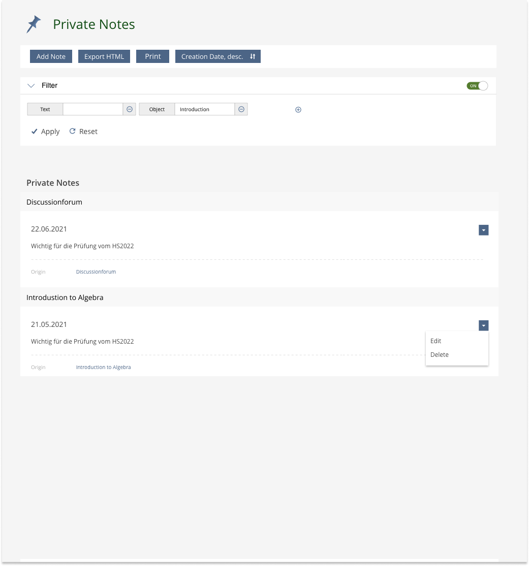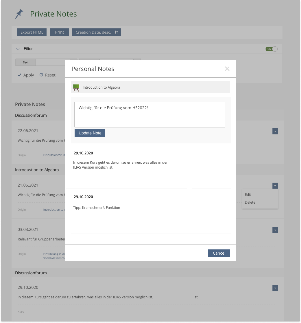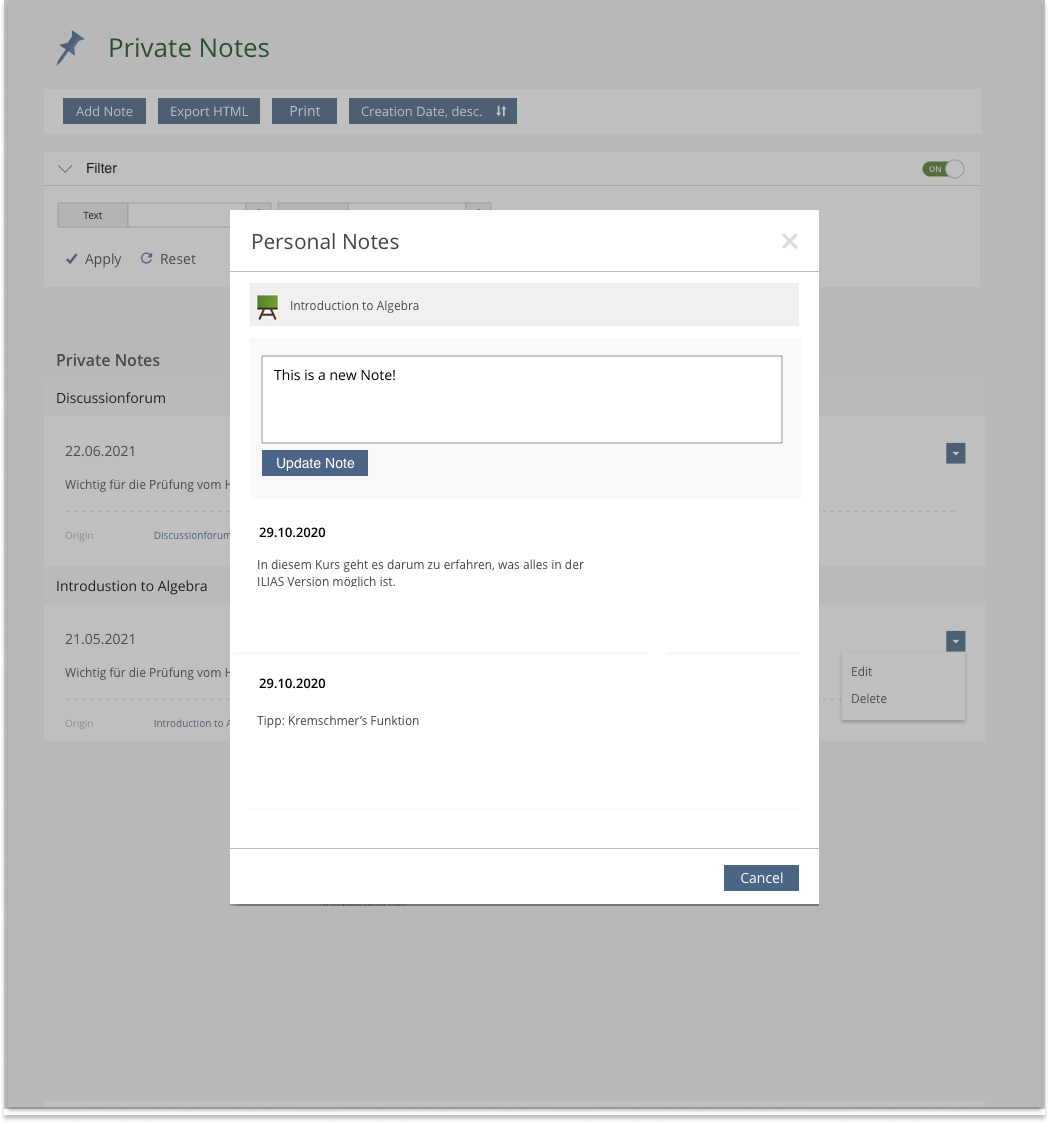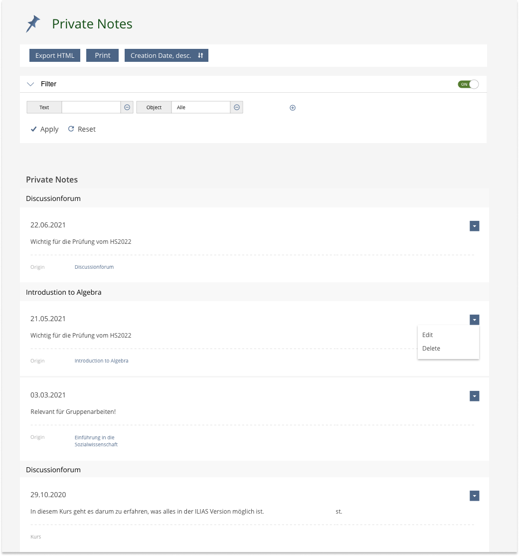 - lists all objects that already have a personal note (f.e. Discussionforum, Introduction of Algebra)