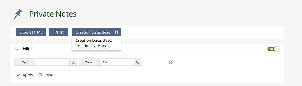Notes without references can be selected via the filter. Afterwards, these notes behave similarly to the other entries (objects) in the filter. A note can be created via the "Add Note"-button.