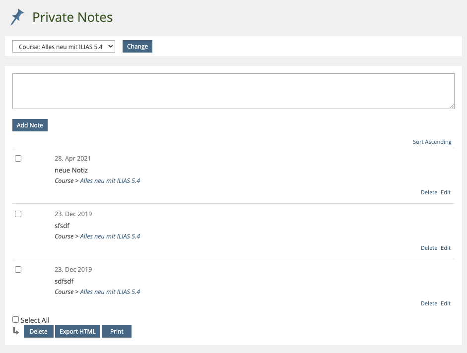 In the context of these adjustments, the existing functions should also be reconsidered and conceptually revised. For example, the question arises as to whether ILIAS should actually be able to use object-independent notes and, if so, what goal is being pursued with this.