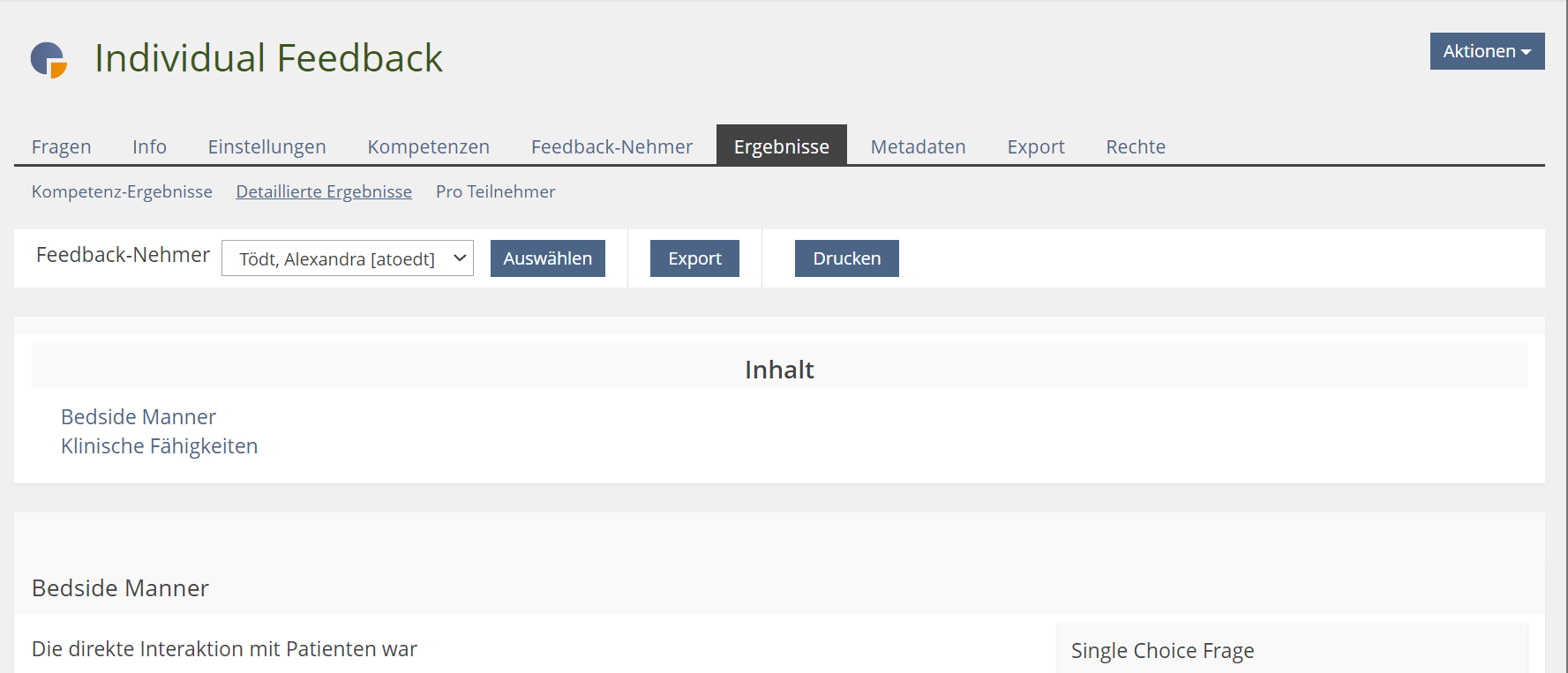 - Results > Details: All questions / Selected questions (checkboxes)