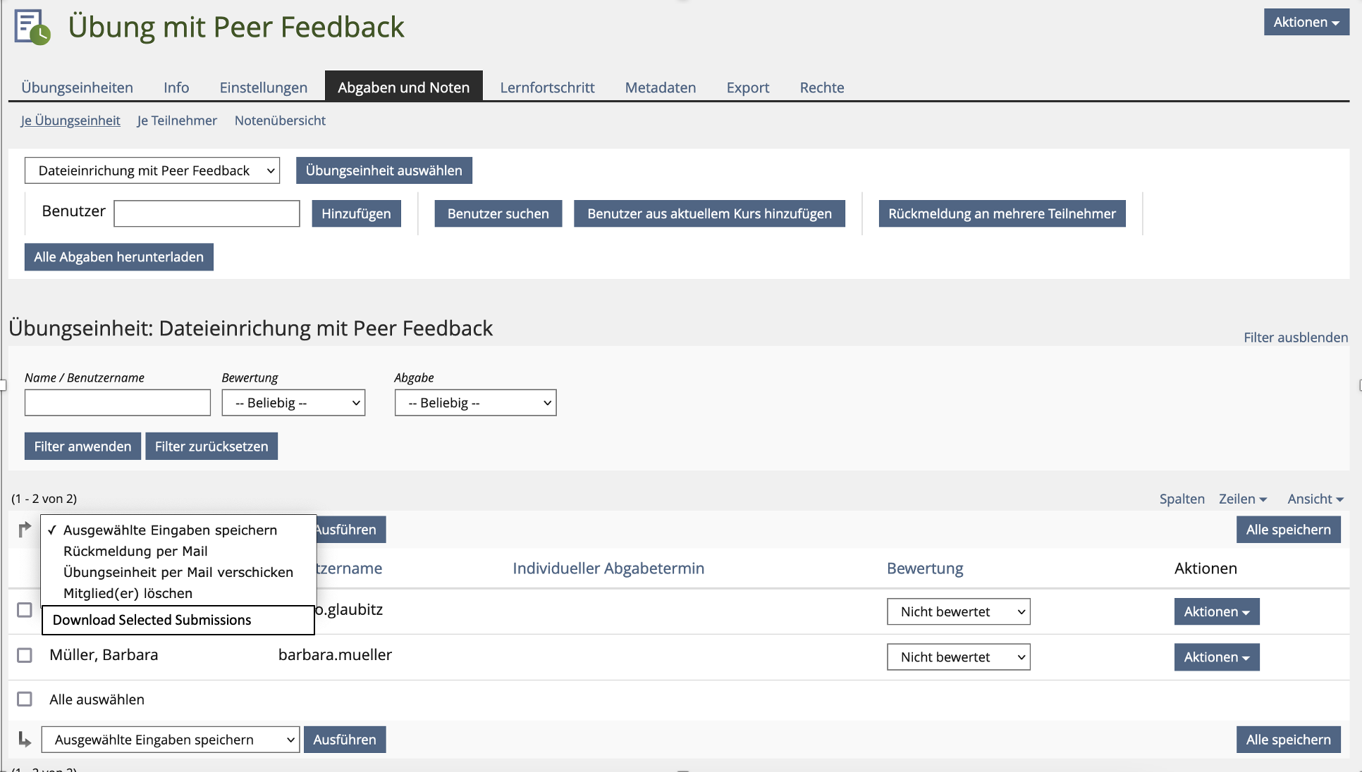 To accomplish this, the multi-action dropdown is supposed to get a new option called "Download Selected Submissions". Just like the button "Download all Submissions", a ZIP file will be created which contain a folder for each participant of the unit.