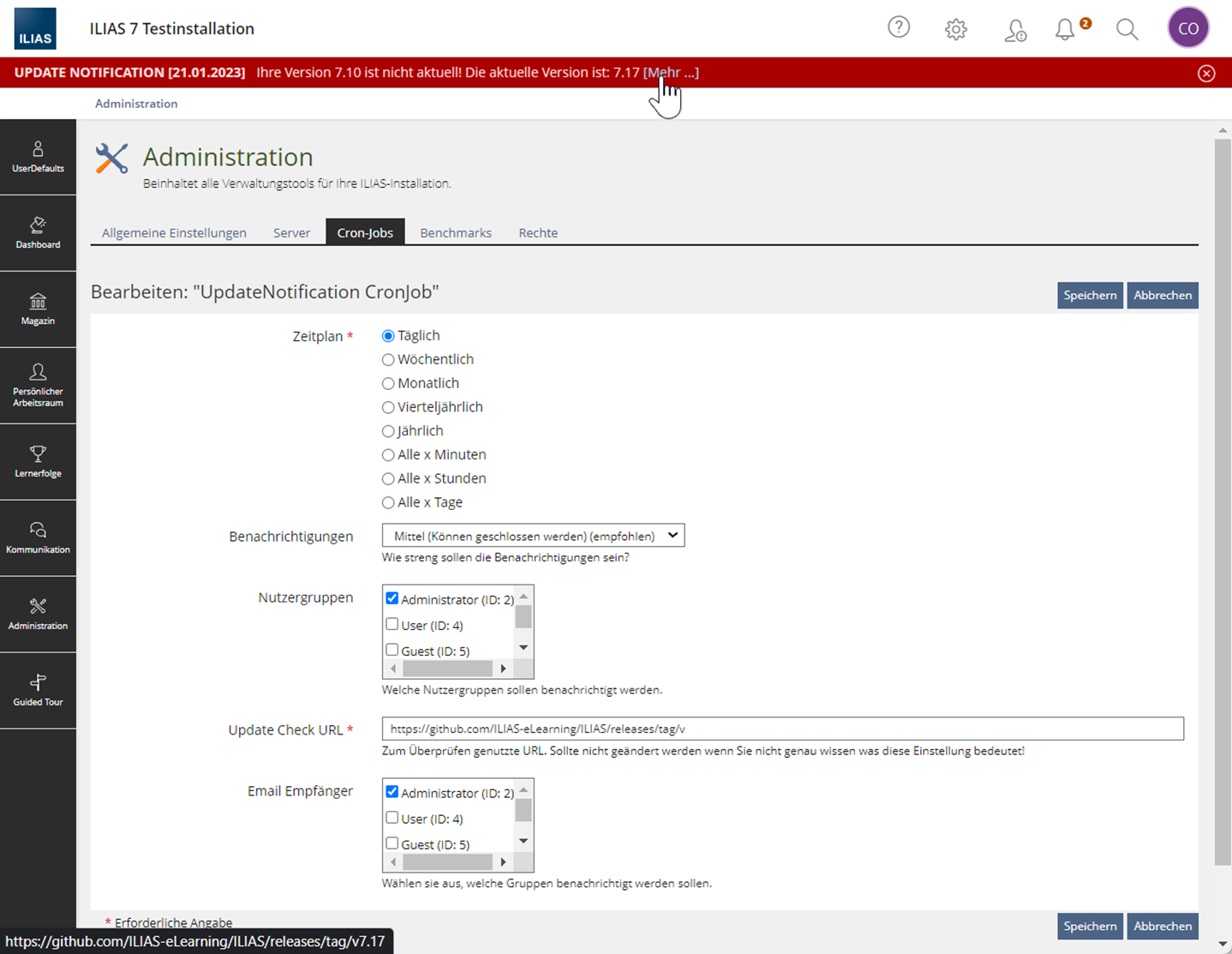 Ich fände es sinnvoller, bei Admin-Login eine separate Notification einzublenden, wenn der letzte Cronjob-Run länger als 48 Stunden zurückliegt „Achtung: Für diese ILIAS-Installation werden derzeit keine Cronjobs ausgeführt – regelmäßige Cronjobs sind für einen ordnungsgemäßen Betrieb von ILIAS essenziell. Bitte prüfen Sie Ihre ILIAS-Installation und stellen Sie sicher, dass Cronjobs mindestens einmal am Tag ausgeführt werden.“. Mit diesem Mechanismus könnten wir dann die Update-Prüfung m.E. ruhigen Gewissens in einem Cronjob ausführen, was ich für insgesamt vorteilhafter halte.
