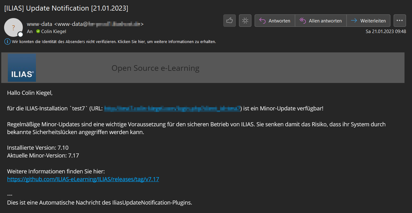 Update Notifications for Minor and Major Updates are provided both as System Notifications and ILIAS Mails to users with certain global roles (default: Administrator).