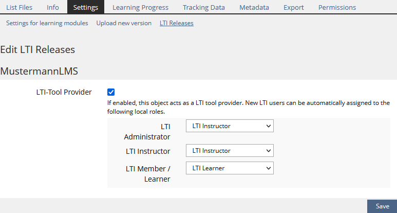 - LTI Instructur: For 'LTI Instructor', the permissions 'Visible', 'Read' and 'Edit Content' should be assigned by default, but no further rights.