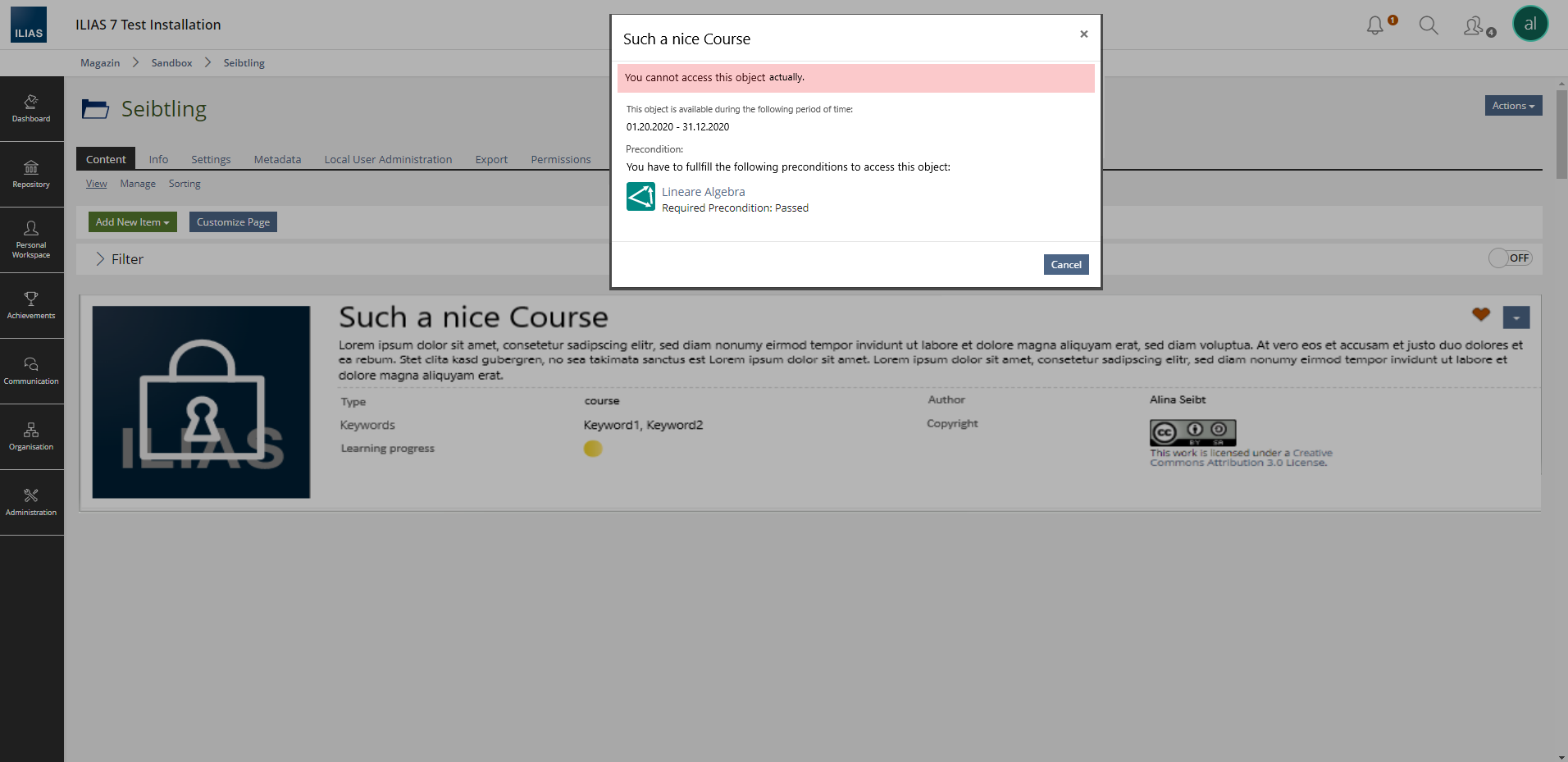- if my precondition object (1) has set preconditions (2) aswell (here: you try to open "such a nice course" but you have to pass the course "Lineare Algebra" (1) - but to access this course you first have to pass another object (2), p.e. a test) - what happens after clicking on the precondtion object (1) in the modal?