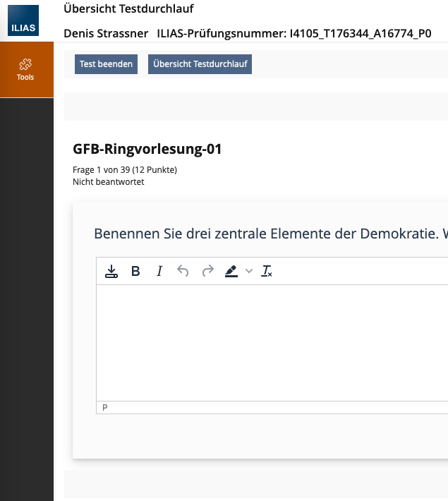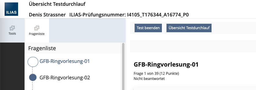 de | Teilnehmer können sich links neben den Testfragen eine Fragenliste anzeigen lassen. Mit dem Button 'Bearbeitungsstand' rufen die Teilnehmer eine Übersicht auf, die zeigt, welche Fragen sie jeweils bereits bearbeitet oder markiert haben. Das Verhalten der Übersicht 'Bearbeitungsstand' können Sie noch weiter konfigurieren: | Mit der Schaltfläche 'Übersicht Testdurchlauf' können Teilnehmer eine Übersicht aufrufen, die zeigt, welche Fragen sie jeweils bereits bearbeitet oder markiert haben. Das Verhalten der 'Übersicht Testdurchlauf' können Sie noch weiter konfigurieren: | Teilnehmer können sich links neben den Testfragen eine Fragenliste anzeigen lassen. |
