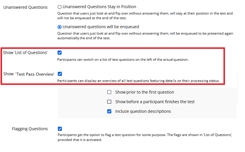 - Activation of “Test Pass Overview” (Checkbox) with sub-options (“Show prior to the first question” s.o.)