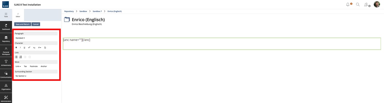 - ILIAS shows you all Anchorable elements underneath the Repository object's title. Below that you will also find your anchor name behind a hash. (E.g. #example anchor)