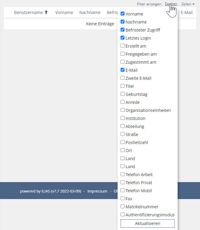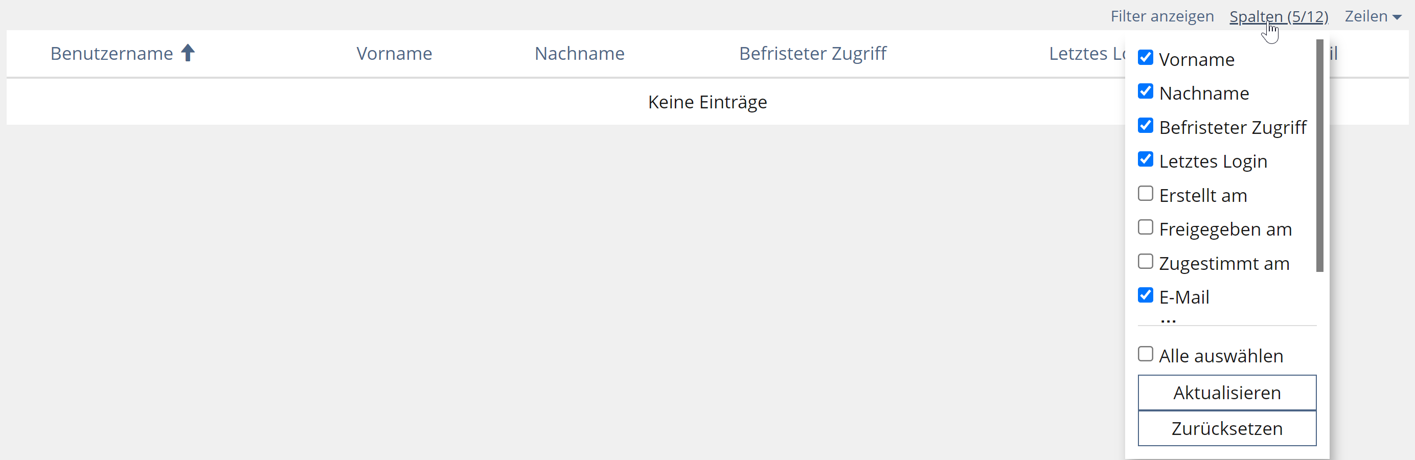 - The "Select all" toggles between selecting all or none of the columns (note: from my experience the first column of a table cannot be de/selected - like "username" for the user administration)