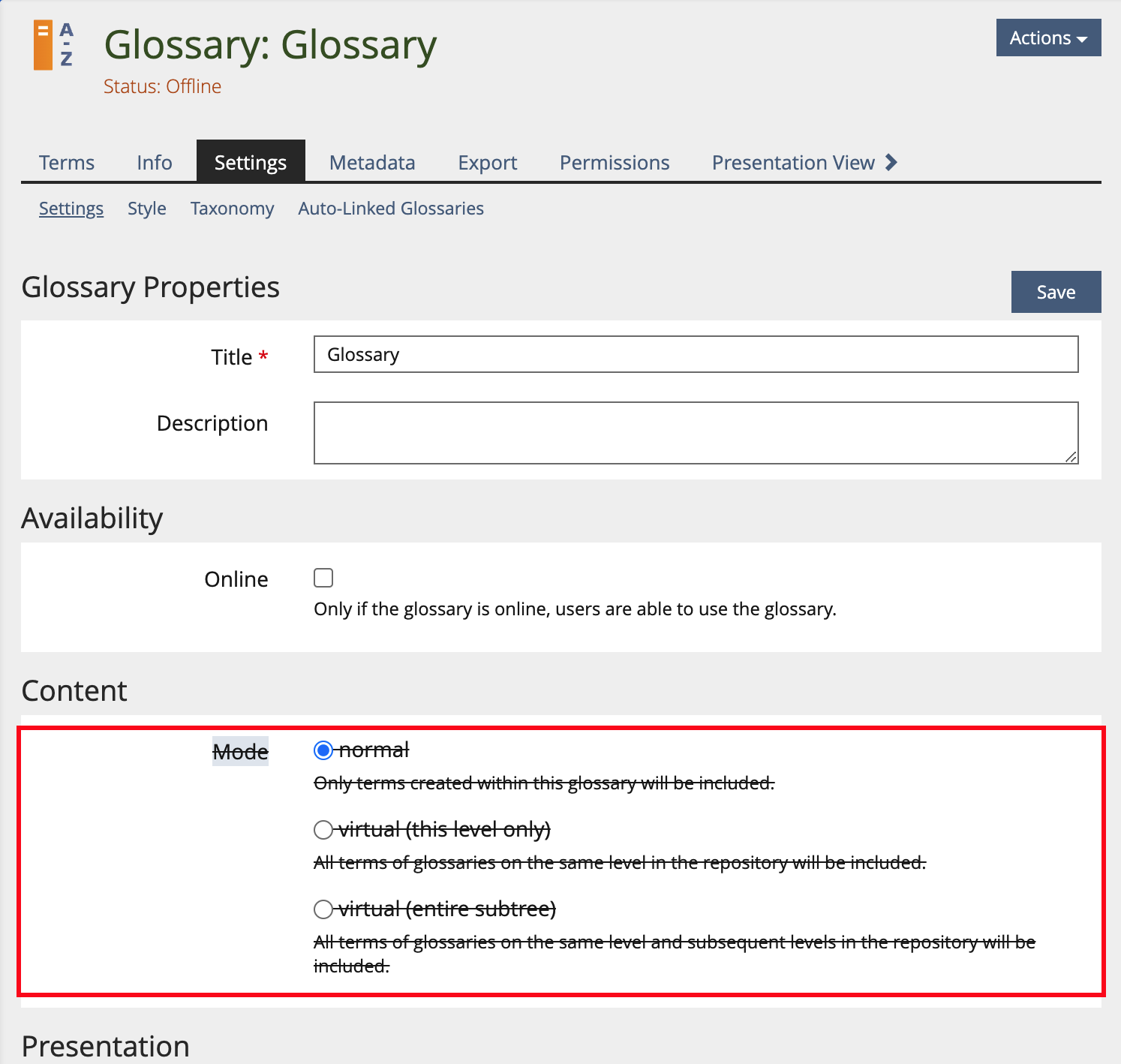 - For existing glossaries of mode "virtual (this level only)" and "virtus (entire subtree)" the migration to ILIAS 9 will remove all glossary terms that have been made in these glossaries. Only the terms from "normal" glossaries of the same level will be kept.