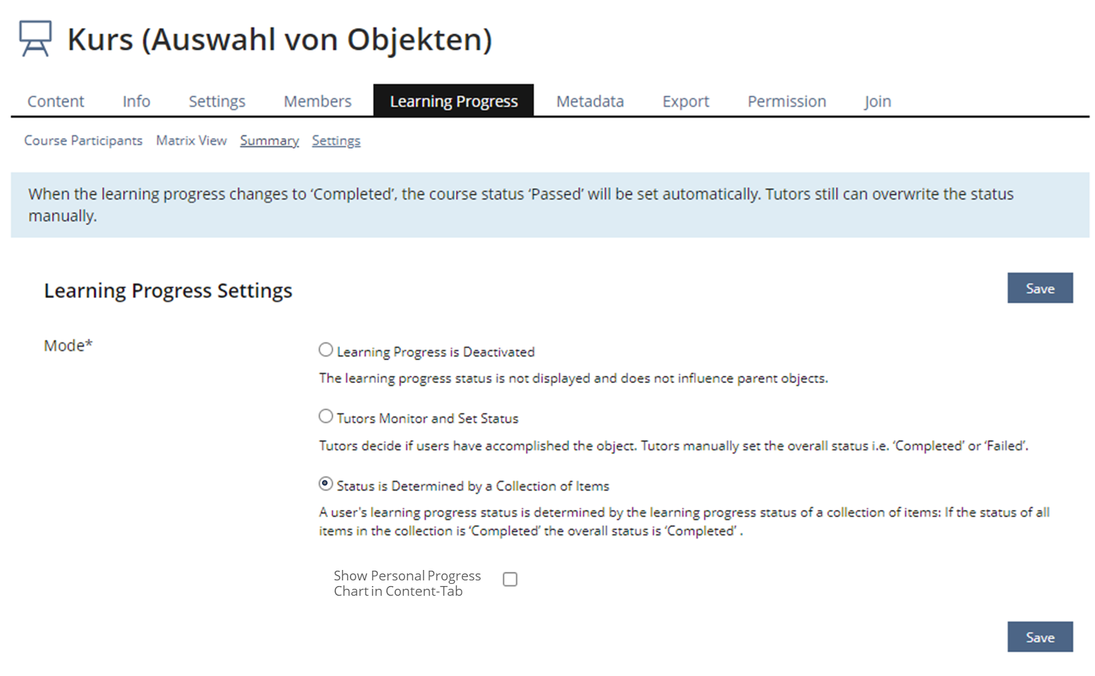 JourFixe, ILIAS [jourfixe], 05 AUG 2024: We highly appreciate this suggestion and schedule the feature for ILIAS 10. We accept the reduction of this new option to the LP status 'Collection'. Using it in combination with 'Tutor sets...' might irritate learners because the progress doesn't change during their learning sessions unless the tutor changes the status from 0 to 100%.