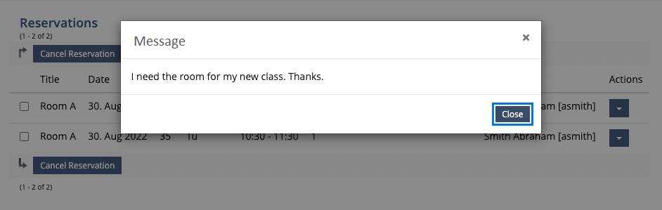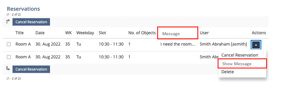 Showing the message in the reservations list.