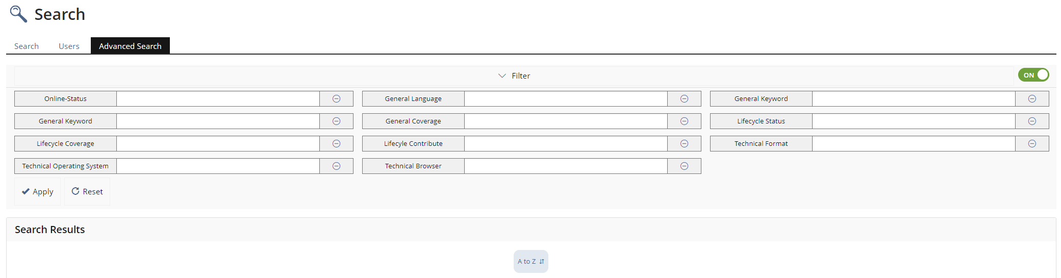 - If the advanced search is integrated into the normal search results, then we have to deal with the fact that normal search results may include a folder and if then Metadata filter of the LOM Metadata is used the results lists is emptied because the folder has no LOM Metadata