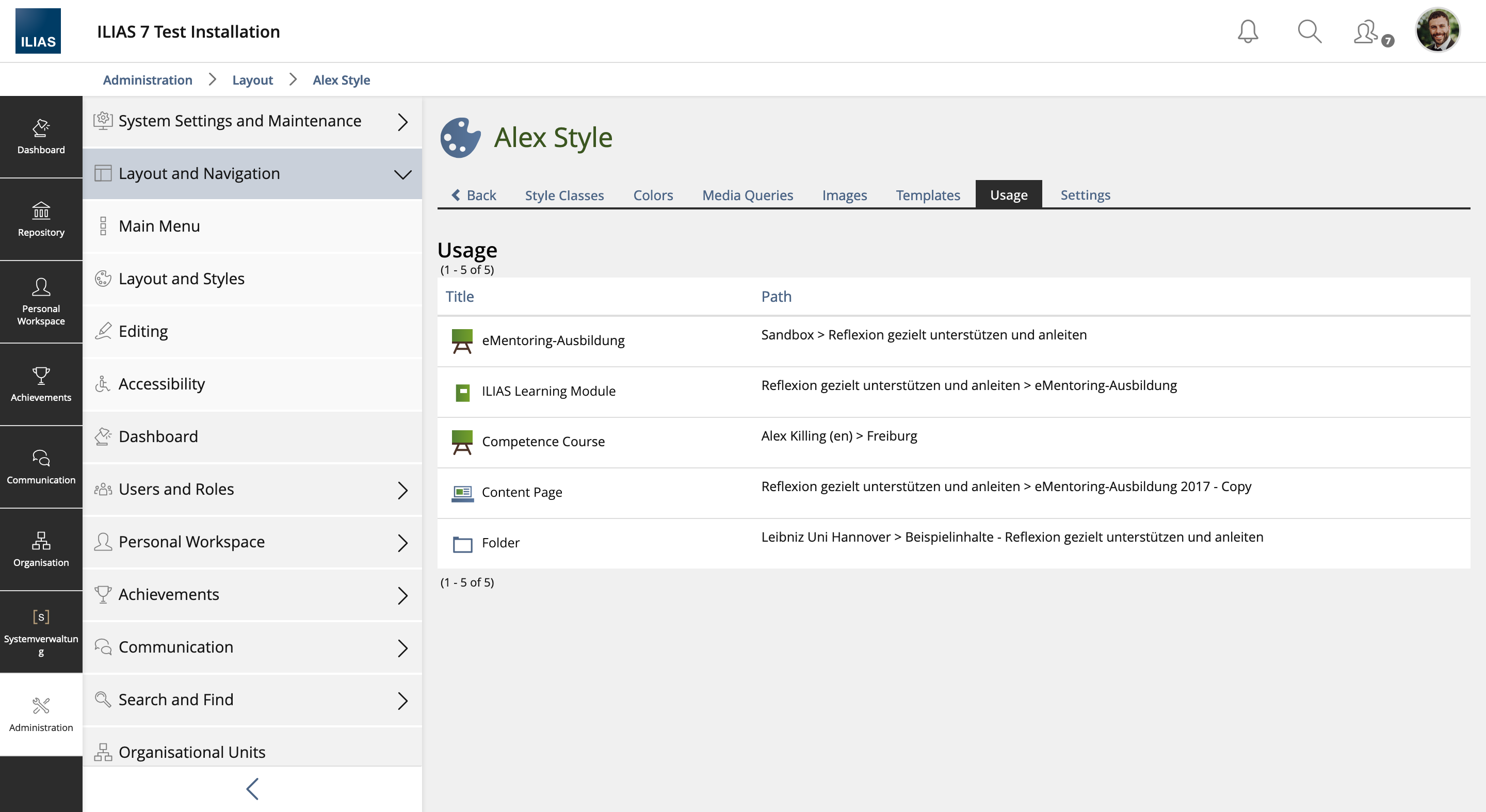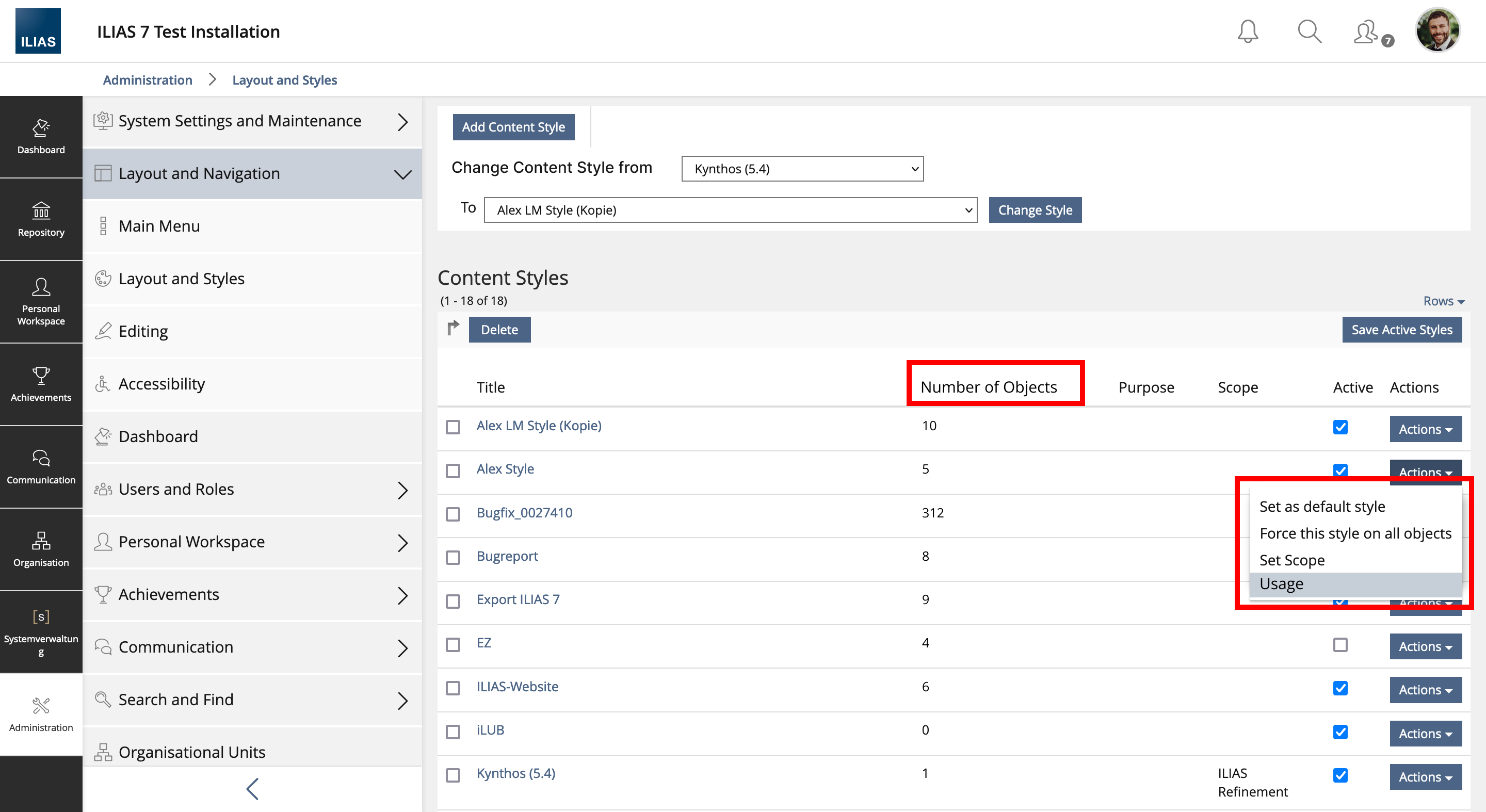 In the dropdown menu of a Content Style, a "Usage"-entry is displayed. If the user clicks on the entry, the "Usage"-tab is displayed in the content style. All objects and their path are listed here.