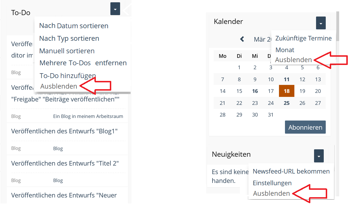 The option "Hide" (Ausblenden) should appear in the actions menu of all dashboard elements. Here by the example of the tasks, the calendar, the news:
