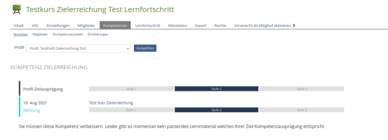 If competence profiles are used in courses and groups, Suggested Learning Resources are also displayed to users. If you pass a Learning Resource, a competence level is reached and displayed in the overview of competences in courses and groups. However, the competency entries achieved by working on Suggested Learning Resources are not taken into account when fulfilling the target level. This confuses users (see Screenshot). In courses and groups, only direct assignments of competencies by course admins or tutors lead to the achievement of a competence target level currently.