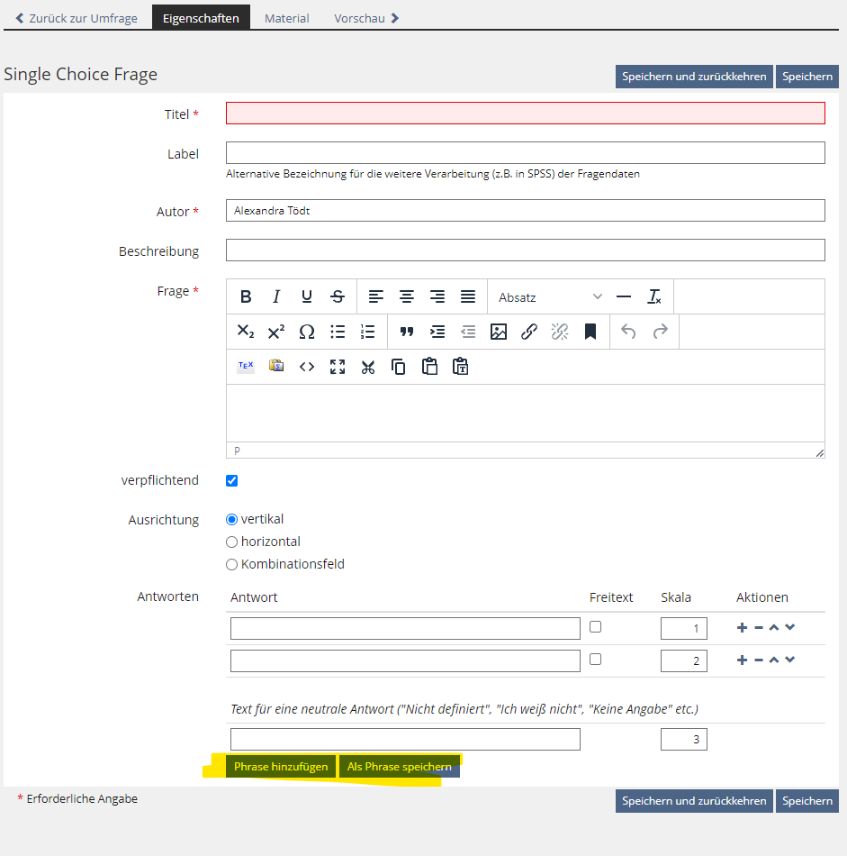 Seibt, Alina [alina.seibt], 11 OKT 2022: Currently, as the author of the question, I can click on "Add phrase" and then get some suggestions of pre-written answer options, i.e. "very good, good, neutral, not good, bad," etc.
