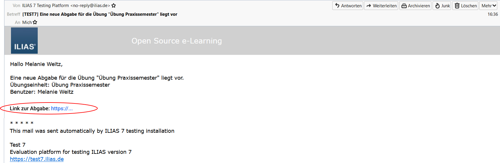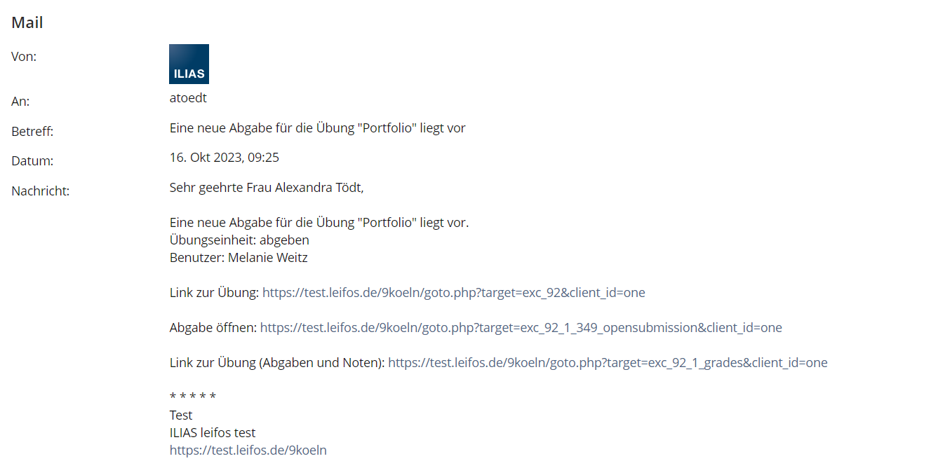 If students submit their portfolio in the context of an assignment, lecturers receive a notification mail that a new submission has taken place. However, the mail only contains: