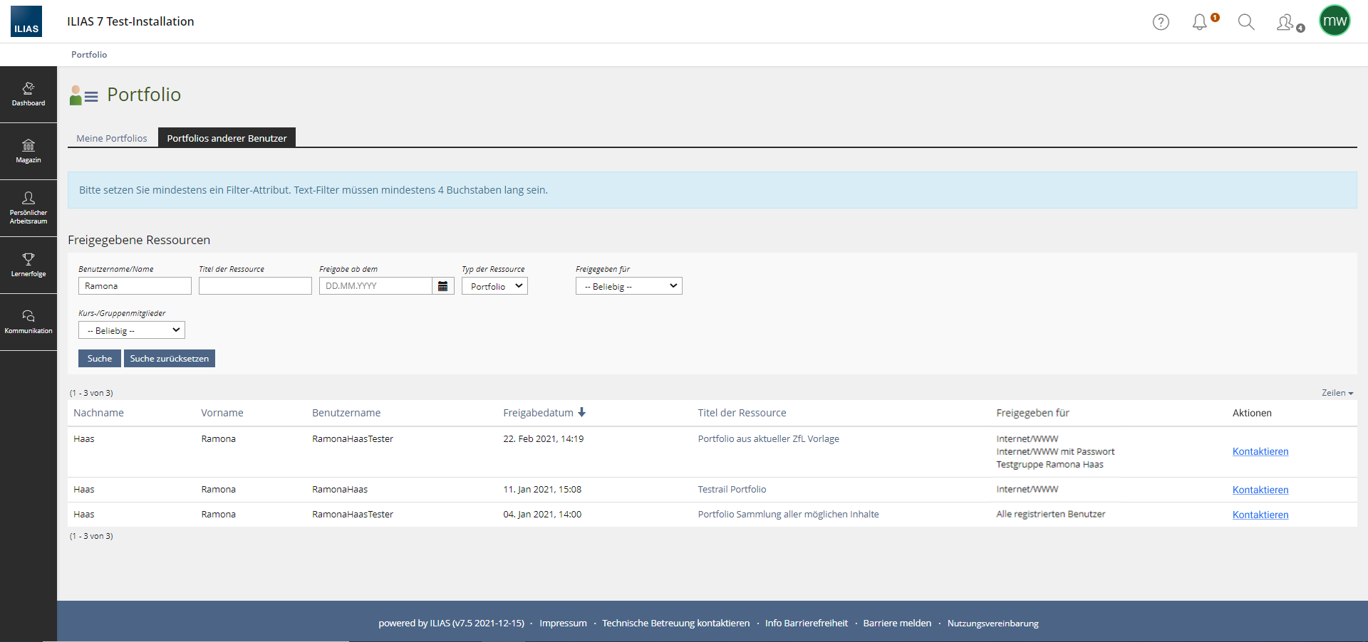 We suggest to integrate a Mailto Feature into the list of "Portfolio of Other Users" in order to reduce the click rate. If the user clicks on the Mailto hyperlink the ILIAS mail compose screen opens with the prefilled name of recipient and subject.