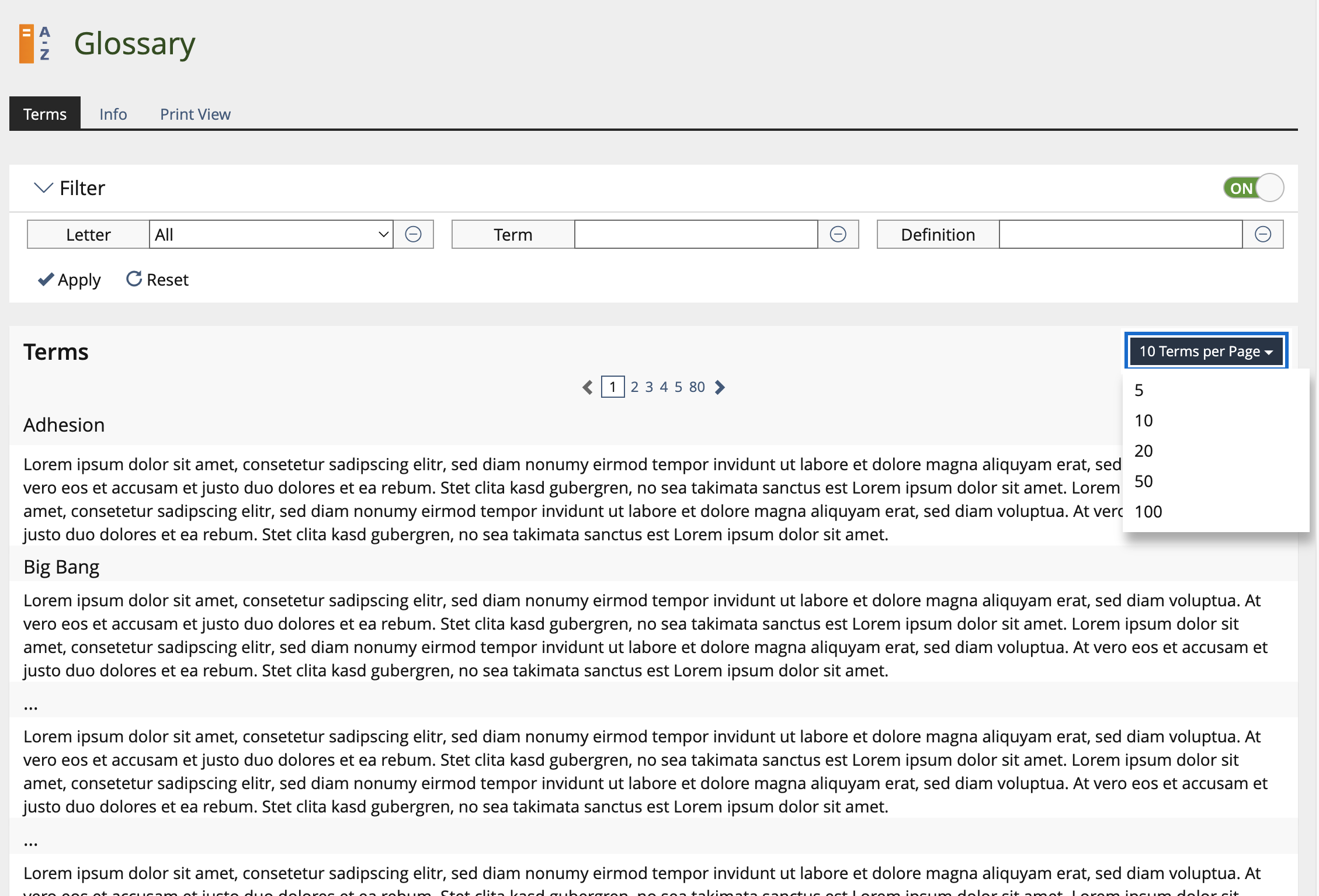 - A Panel Dropdown for selecting numbers of terms per page