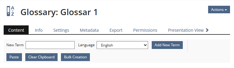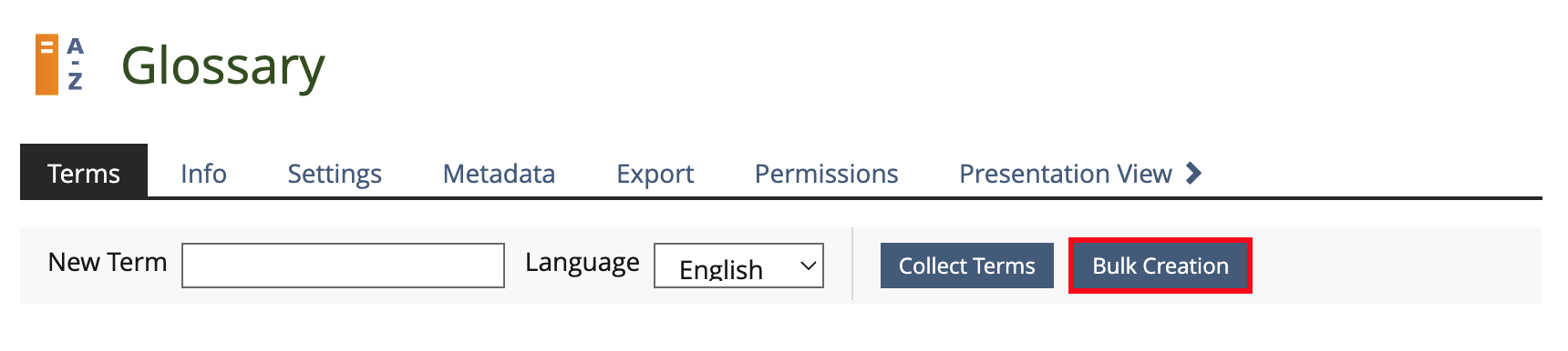 Process starts in "Glossary > Editing > Terms" view. A new Button "Bulk Creation" opens the input form.