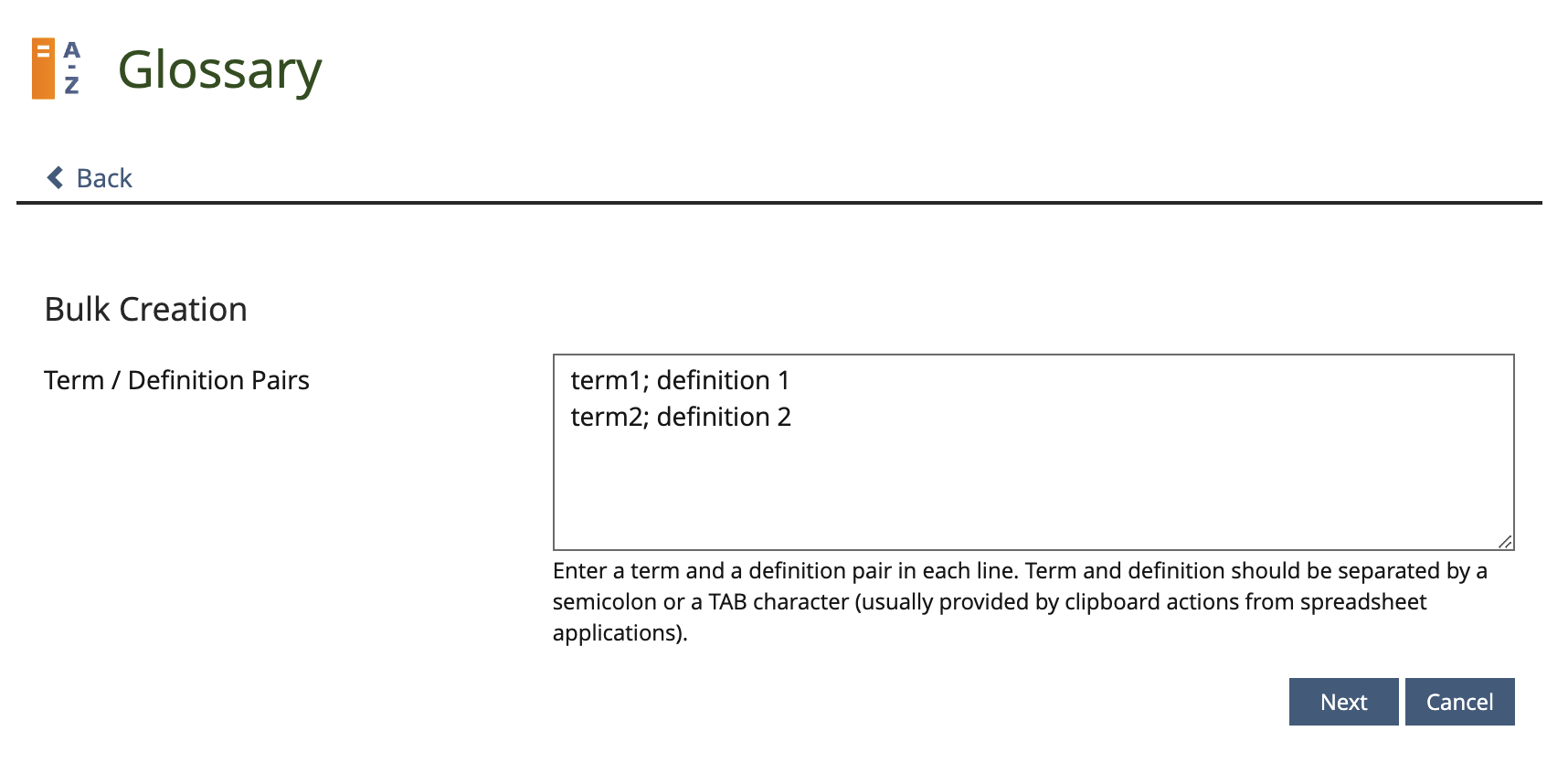 JourFixe, ILIAS [jourfixe], 22 AUG 2022: We highly appreciate this suggestion and schedule the feature for ILIAS 9. Similar to Import Booking Objects into Booking Tool we prefer to have the confirmation screen in step 3 as a confirmation modal with buttons to Create the glossary terms and definitions of to Cancel the action. Escaping of semicolon and tab will not be supported.