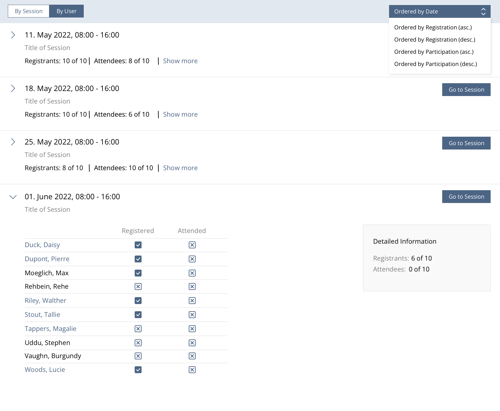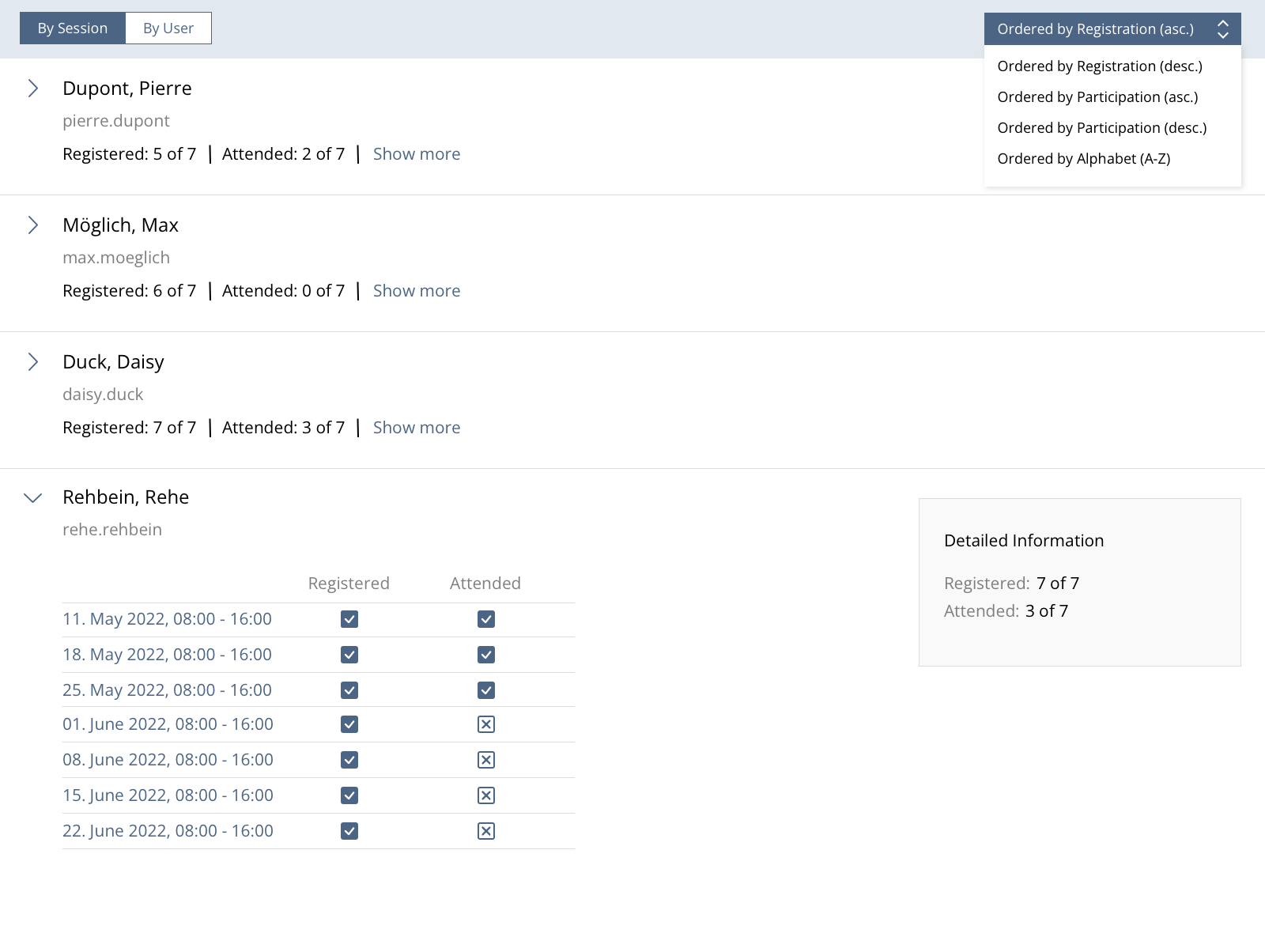 For each participant of a session attendance and registration are stored and displayed if the respective feature is activated.