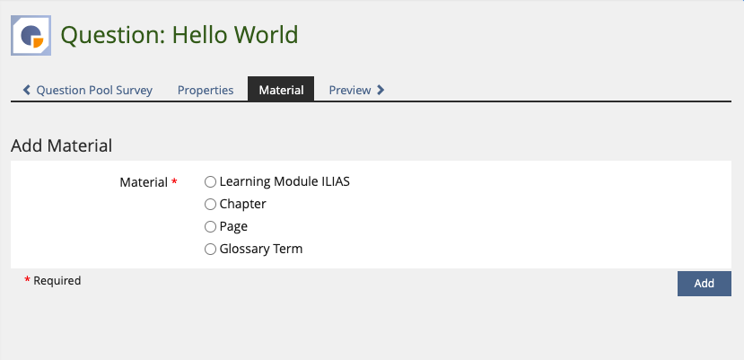 The feature to assign "materials" to survey question is a quite old implementation never been generalised to support other object types (e.g. files). It seems to be used very little and be removed.
